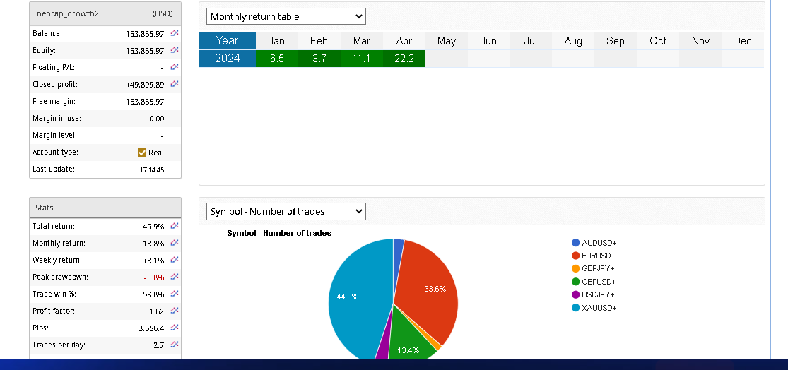 The EA_GROWTH April 2024 returns rises to +22% in the current month . This is a system that operates on MT4. Exceptionally consistent and uses 1:2 r:r.