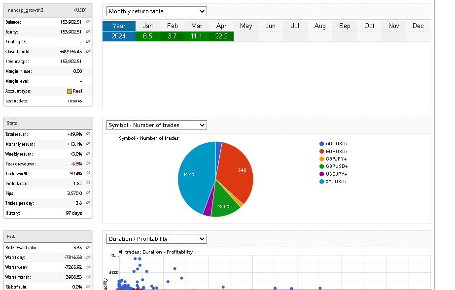 The EA_GROWTH April 2024 returns rises to +22.2% in the current month . This is a system that operates on MT4. Exceptionally consistent and uses 1:2 r:r.