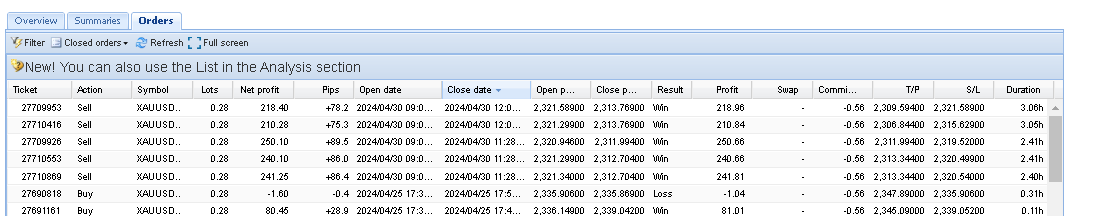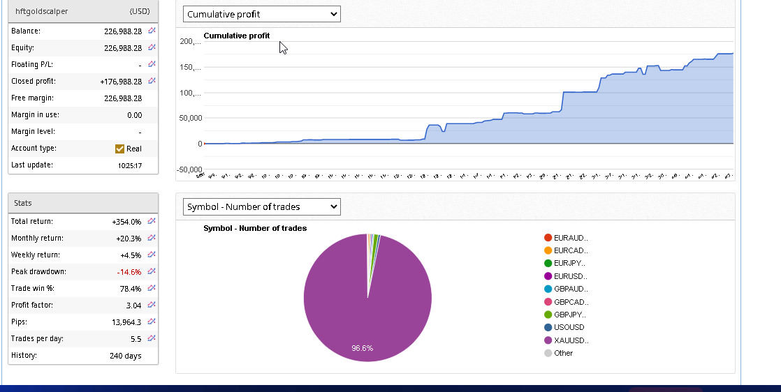 The MT4 EA GOLDSCALPER has continued to rise sharply higher. Returns for April 2024 has hit +17.5%. Every single month in 2024 has shown above 10% return. Total returns = +354% The system only trades GOLD on this account. The live account performance is shown below. Client trades are adjusted as per account size. A min balance of $1000 is all that is needed to run the system. Profits build over time and many have seen their account grow 2x since starting with us. Every month returns are above 10% in 2024 as seen below. Overall returns cross +354% at max DD of 15% Gold Scalper system is one of a kind MT4 system and running on the live account.