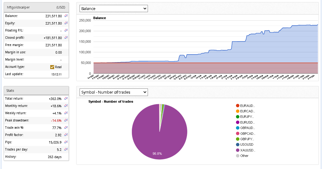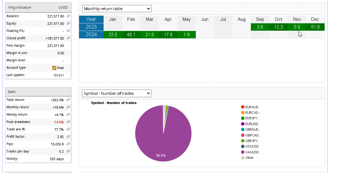 The MT4 EA GOLDSCALPER has continued to rise sharply higher. Returns for May 2024 has hit +1.9%. Total returns = +363% The system only trades GOLD on this account. The live account performance is shown below. Client trades are adjusted as per account size. A min balance of $1000 is all that is needed to run the system. Profits build over time and many have seen their account grow 2x since starting with us. Every month returns are above 10% in 2024 as seen below. Overall returns cross +363% at max DD of 15% Gold Scalper system is one of a kind MT4 system and running on the live account.