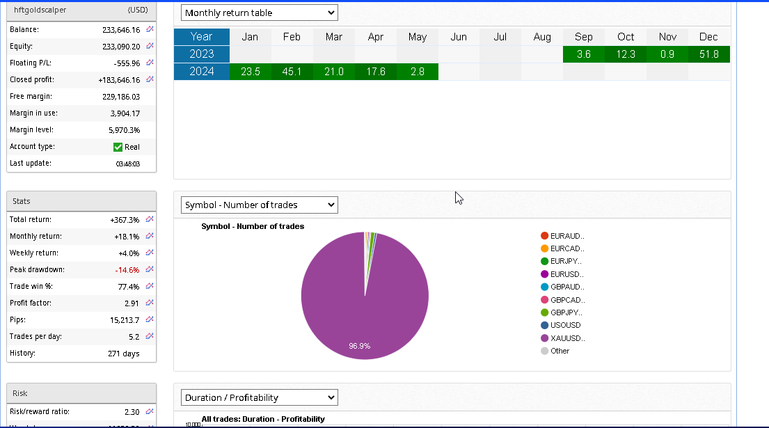 The MT4 EA GOLDSCALPER has continued to rise sharply higher. Returns for May 2024 has hit +2.8%. It is another strongly positive month. Trades were lesser this month due to lesser opportunities. Total returns = +367% The system only trades GOLD on this account. The live account performance is shown below. Client trades are adjusted as per account size. A min balance of $1000 is all that is needed to run the system. Profits build over time and many have seen their account grow 2x since starting with us. Every month returns are above 10% in 2024 as seen below. Overall returns cross +367% at max DD of 15% Gold Scalper system is one of a kind MT4 system and running on the live account.