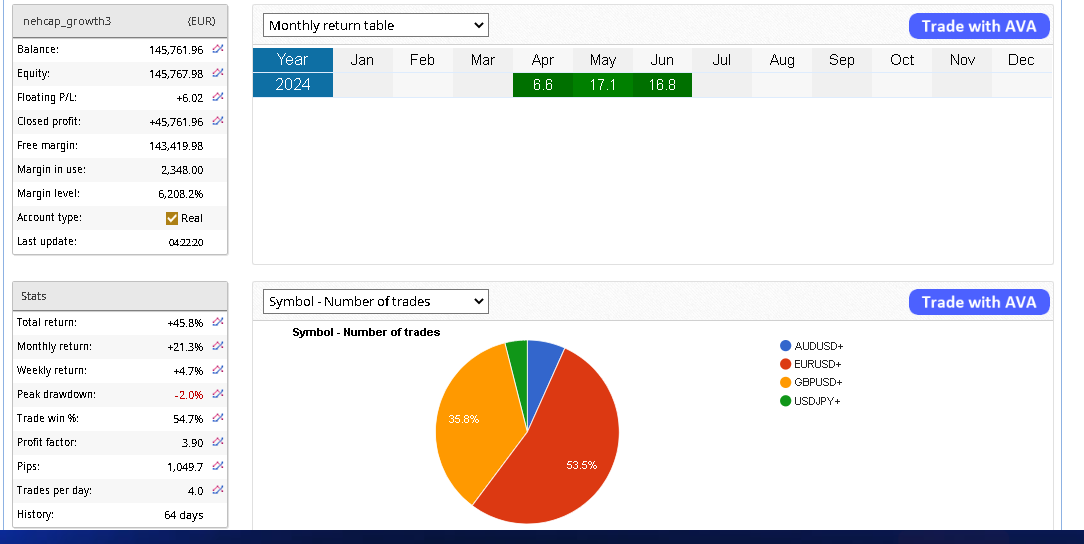 The EA_GROWTH June 2024 returns rises to +17%. This is a system that operates on MT4. Exceptionally consistent and uses 1:2 r:r. This is the finest forex system for MT4 accounts. Not a scalper so safe to trade on any VPS. This is stable system running on live capital.