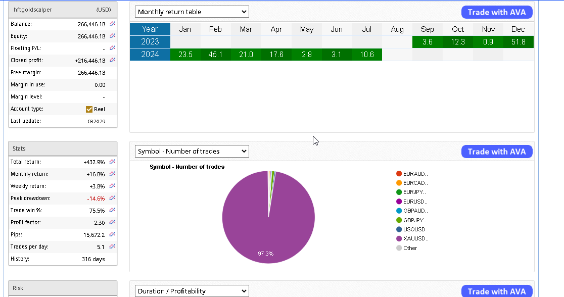 EA GOLDSCALPER JULY RETURNS RISES ABOVE +10% OVERALL RETURN = +432% MAX DD =15%