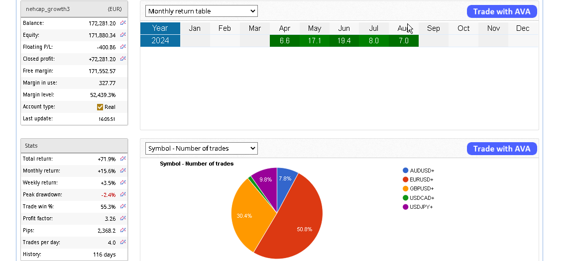 The EA_GROWTH August 2024 returns rise and add solid gains to our 100k account. The current returns for this month is at +7%.