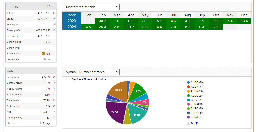 The HFT_FIX system has consistently delivered outstanding performance since its launch in February 2023, providing steady and reliable results. Designed for professional traders and large accounts, it leverages the FIX protocol to execute high-frequency trades with exceptional accuracy.