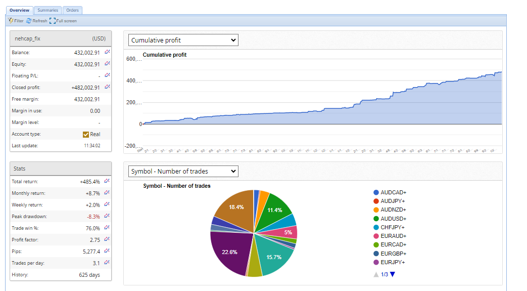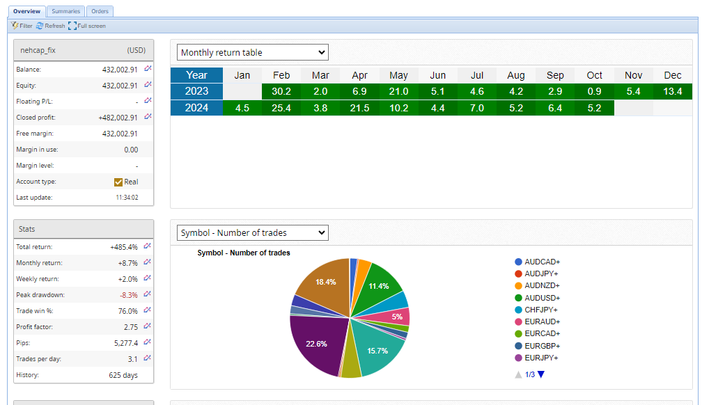 The HFT_FIX system has consistently delivered outstanding performance since its launch in February 2023, providing steady and reliable results. Designed for professional traders and large accounts, it leverages the FIX protocol to execute high-frequency trades with exceptional accuracy.