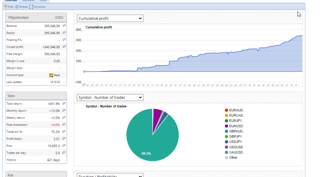 The equity curve for GoldScalper EA demonstrates a steady, upward trajectory, highlighting the system’s consistent profitability and low drawdowns. This smooth curve underscores the effectiveness of its high-frequency trading strategy, with minimal volatility and sustained growth over 421 trading days. The system’s disciplined approach provides reliable returns, reinforcing its appeal to investors seeking stability and long-term gains.