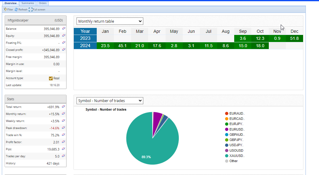 GoldScalper EA continues to deliver robust and consistent performance, recording a strong +18% return in October, contributing to a remarkable total return of +691.9% since inception. With an equity balance of $395,946.89, the system showcases steady capital growth and sustained profitability. The EA maintains a peak drawdown of -14.6%, demonstrating effective risk management while achieving a trade win rate of 75.2%. Its high-profit factor of 2.01 and average monthly return of +15.5% underline its efficiency in capitalizing on market volatility, particularly within the GOLD market.