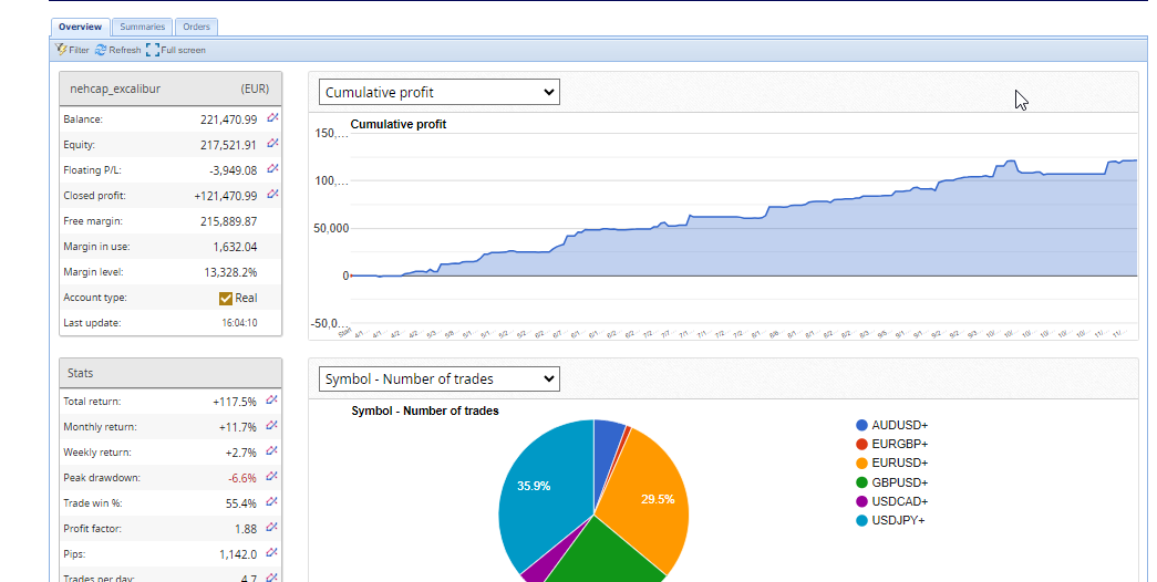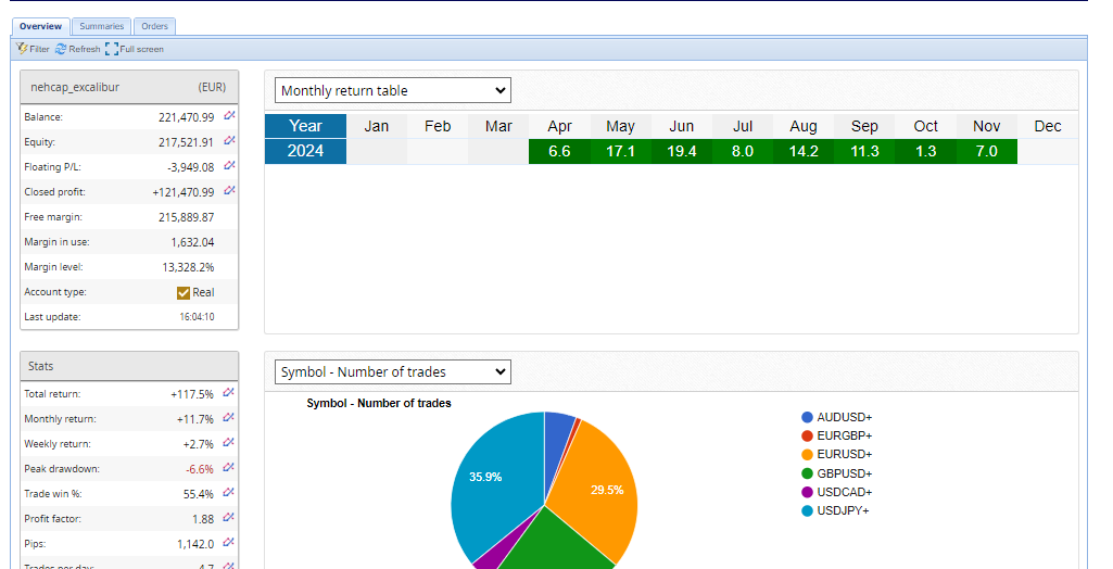EXCALIBUR’s diversified trading across currency pairs—primarily AUDUSD, EURGBP, EURUSD, GBPUSD, with minor trades in USDCAD and USDJPY—spreads risk while capturing a range of trading opportunities. This balance enhances the system’s adaptability and reliability, making it an attractive choice for investors seeking steady growth with controlled risk.