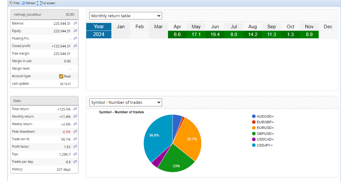 The EA EXCALIBUR continues to excel as November returns hit 8.9%. DD under 10%. Total returns = +125%