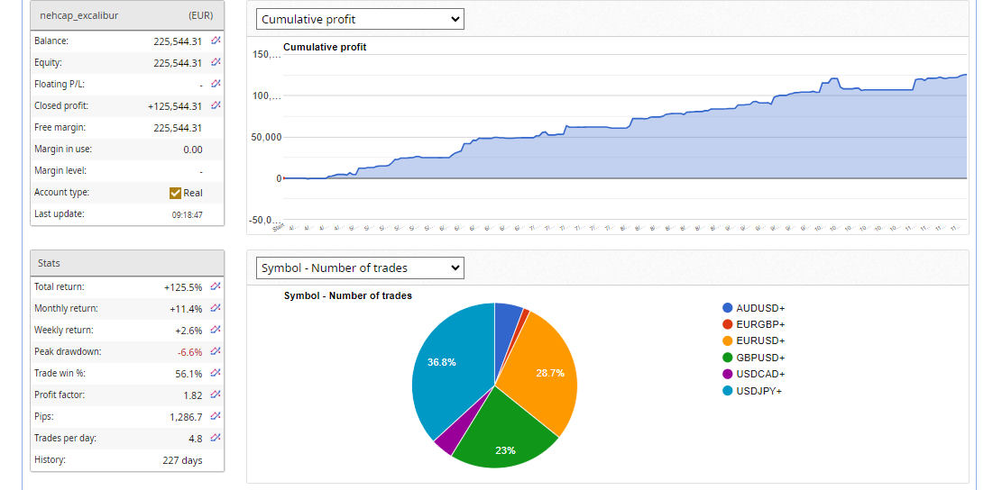 EXCALIBUR’s diversified trading across currency pairs—primarily AUDUSD, EURGBP, EURUSD, GBPUSD, with minor trades in USDCAD and USDJPY—spreads risk while capturing a range of trading opportunities. This balance enhances the system’s adaptability and reliability, making it an attractive choice for investors seeking steady growth with controlled risk.