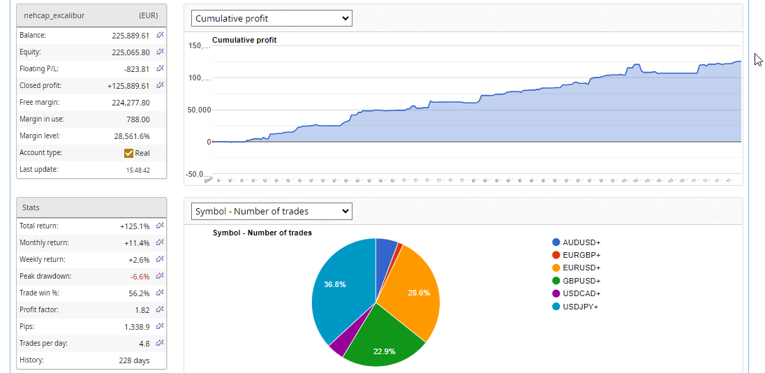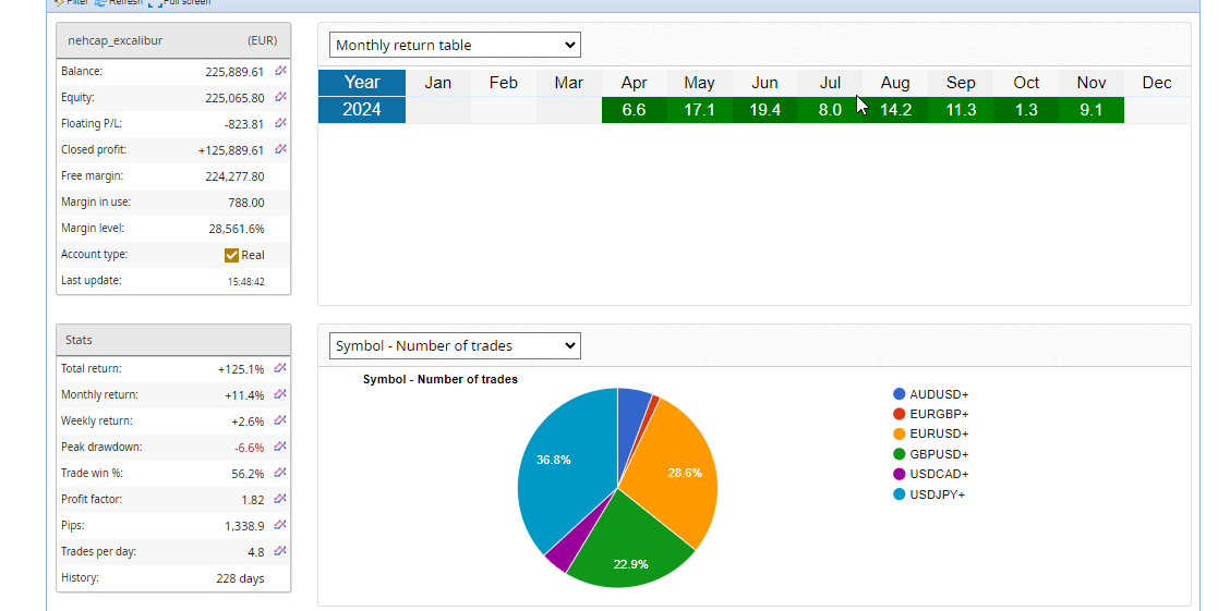 EXCALIBUR’s diversified trading across currency pairs—primarily AUDUSD, EURGBP, EURUSD, GBPUSD, with minor trades in USDCAD and USDJPY—spreads risk while capturing a range of trading opportunities. This balance enhances the system’s adaptability and reliability, making it an attractive choice for investors seeking steady growth with controlled risk.
