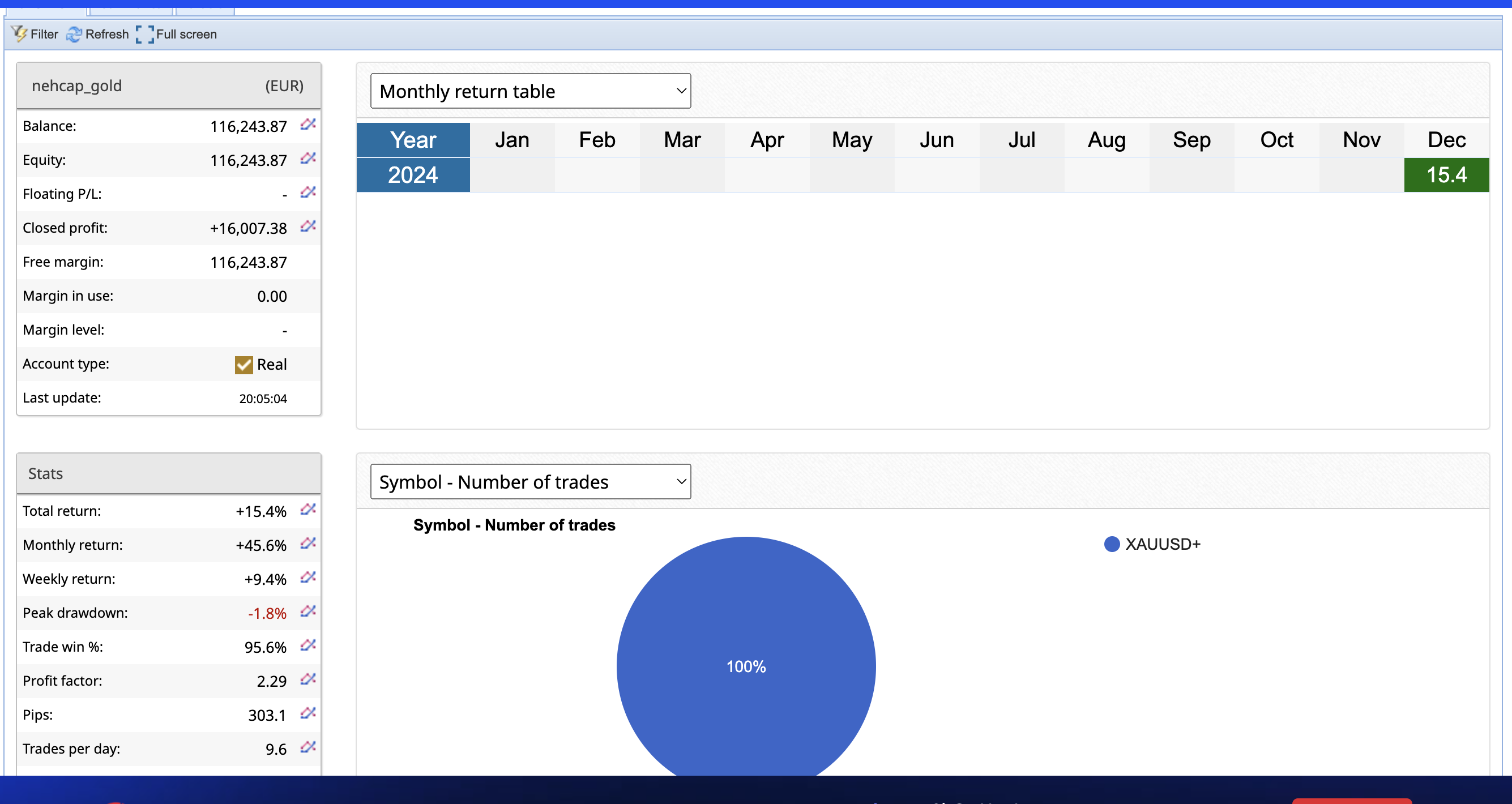 - Drawdown: Kept to a maximum of 15%, ensuring stable equity growth through prudent risk management.