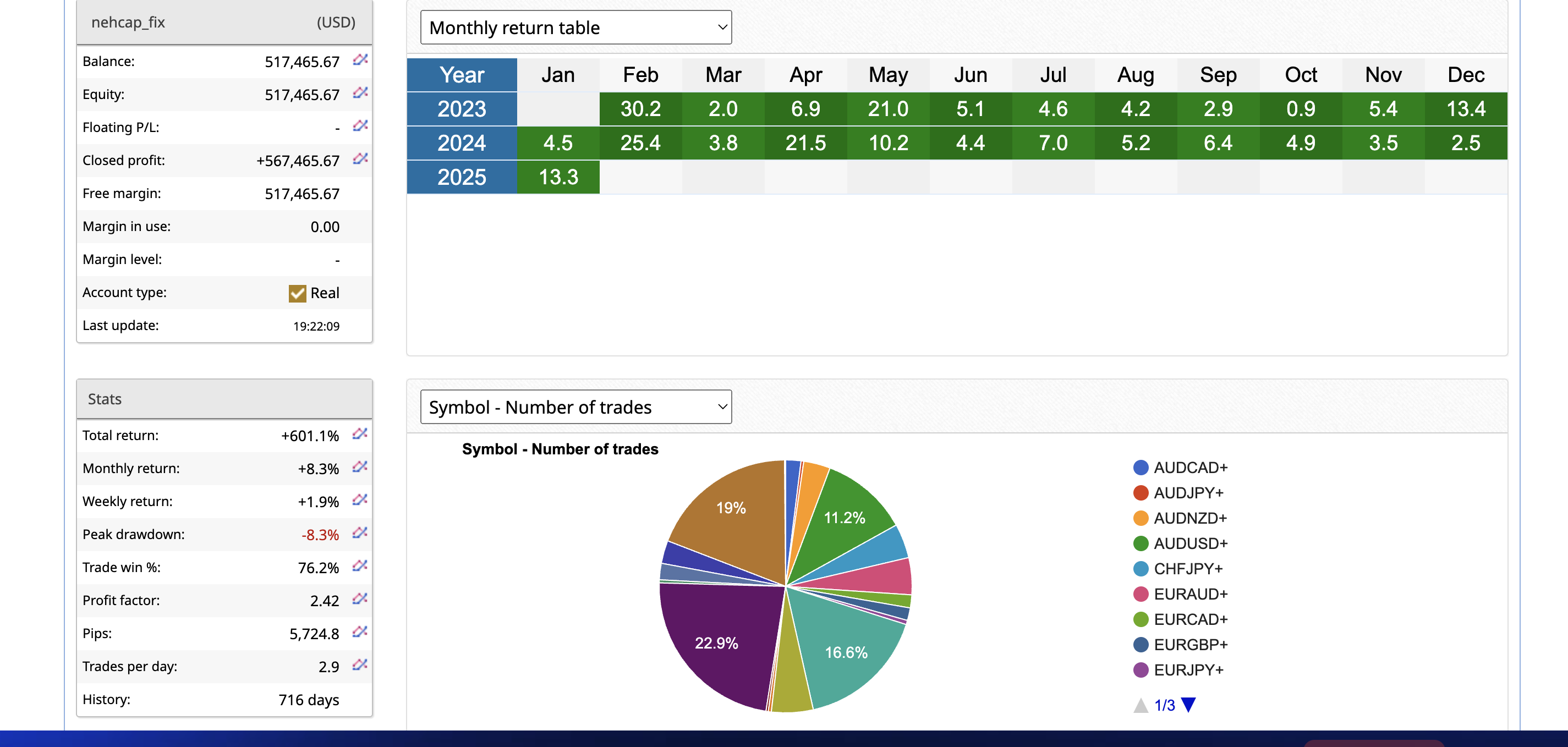 The HFT_FIX January 2025 returns climb +13 % as steadily returns dripped into the nearly half a million account. December closed with +2.5% gain. High precision and High accuracy trading. Non-Grid and Non-martingale.