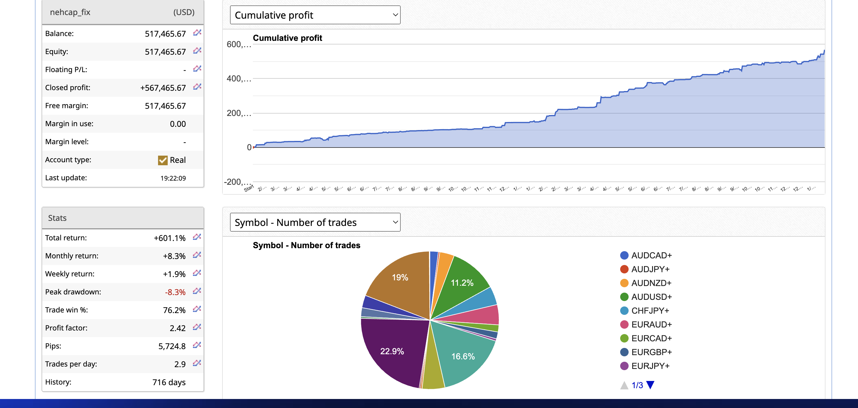hft_fix continues to deliver outstanding results, consistently proving its reliability as a high-frequency trading system. Its landmark achievement of +500% overall returns, combined with controlled drawdowns and steady profit accumulation, solidifies its position as a leading tool for traders seeking consistent growth in a dynamic market. The system’s ongoing success underscores its value in the HFT domain, providing a strong foundation for future gains.