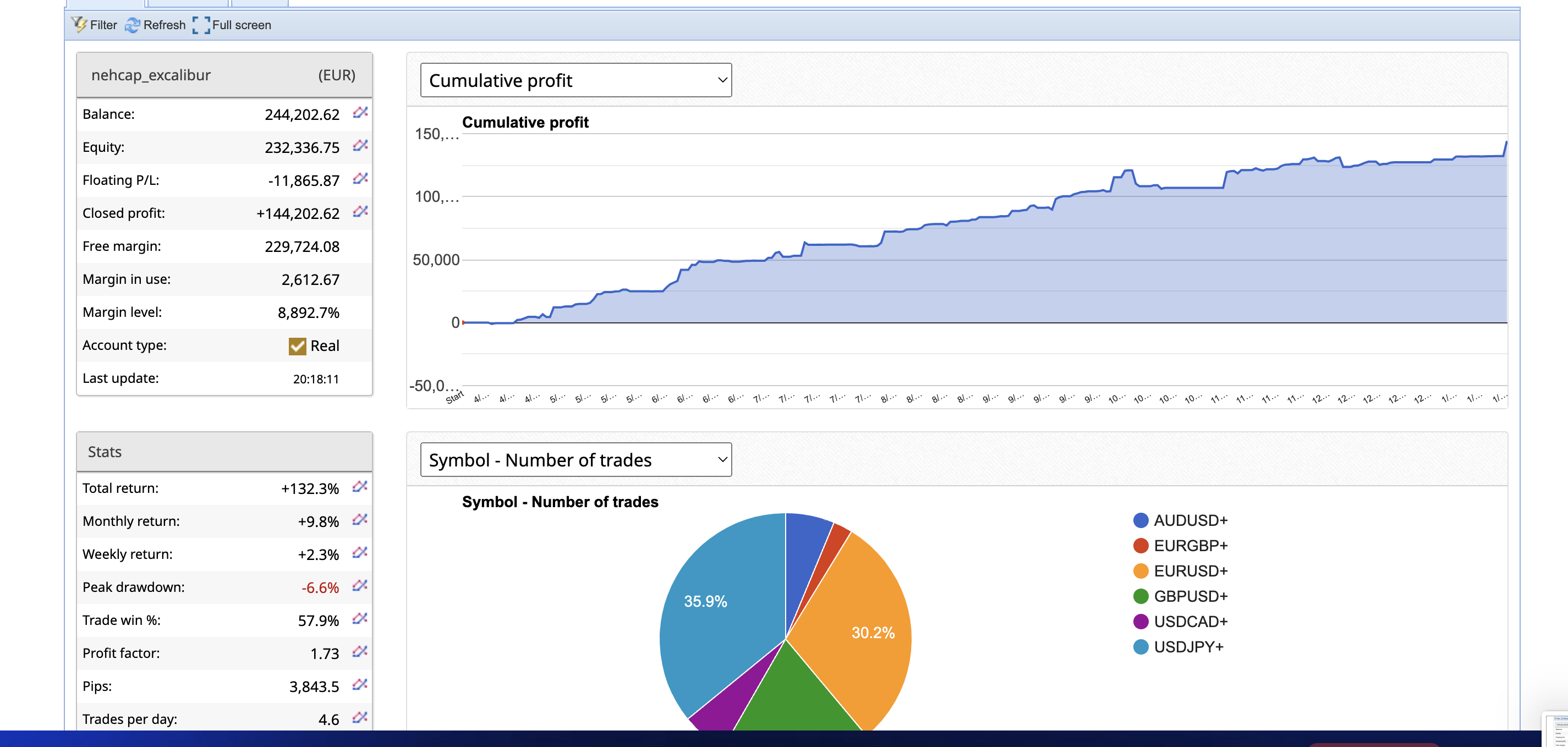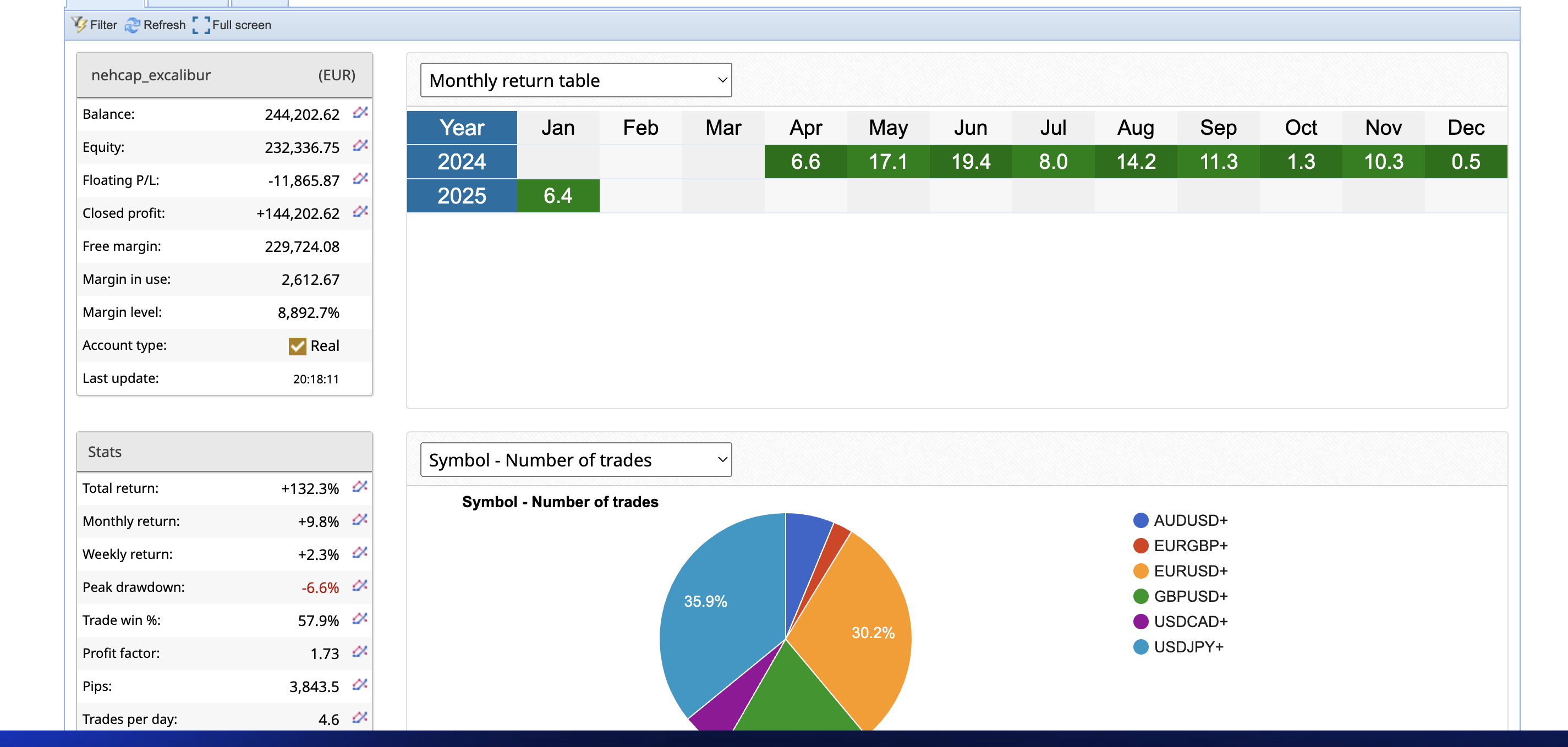 EXCALIBUR’s diversified trading across currency pairs—primarily AUDUSD, EURGBP, EURUSD, GBPUSD, with minor trades in USDCAD and USDJPY—spreads risk while capturing a range of trading opportunities. This balance enhances the system’s adaptability and reliability, making it an attractive choice for investors seeking steady growth with controlled risk.