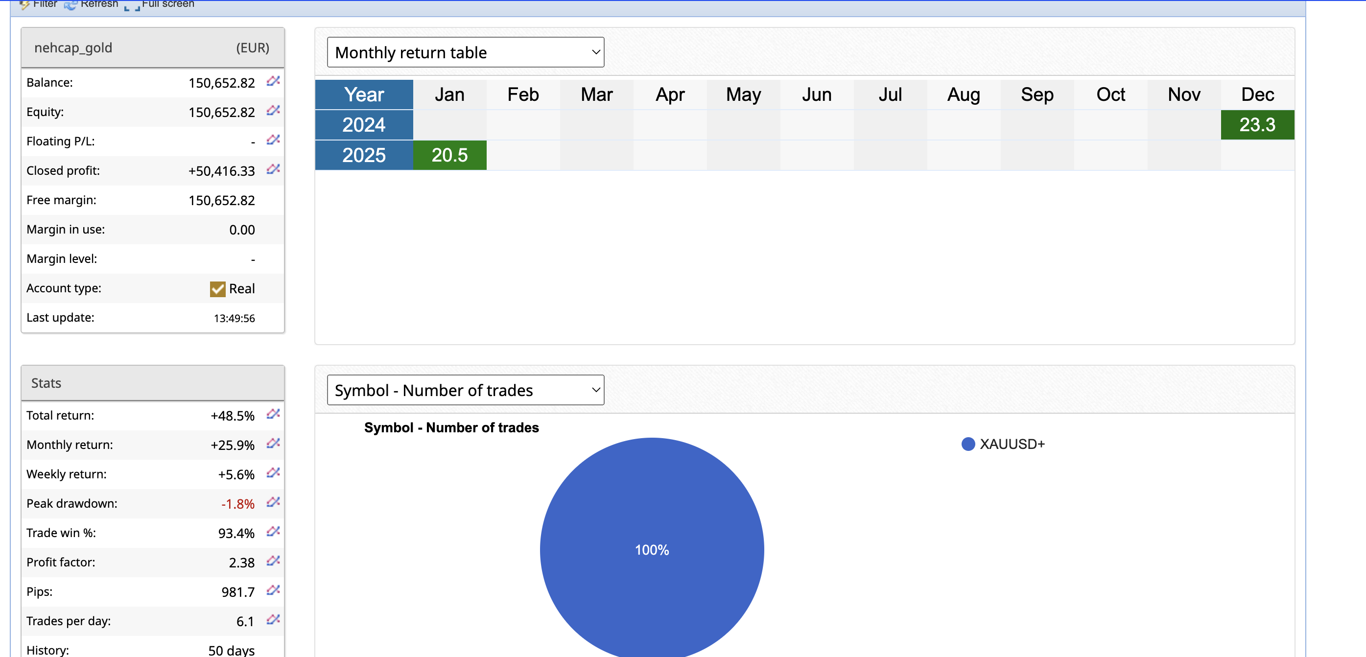 GOLDSCALPER returns steady rise in January as returns rise to +20.5% in January 2025. December 2024 closed with a brilliant +23.5% as shown in live account below.