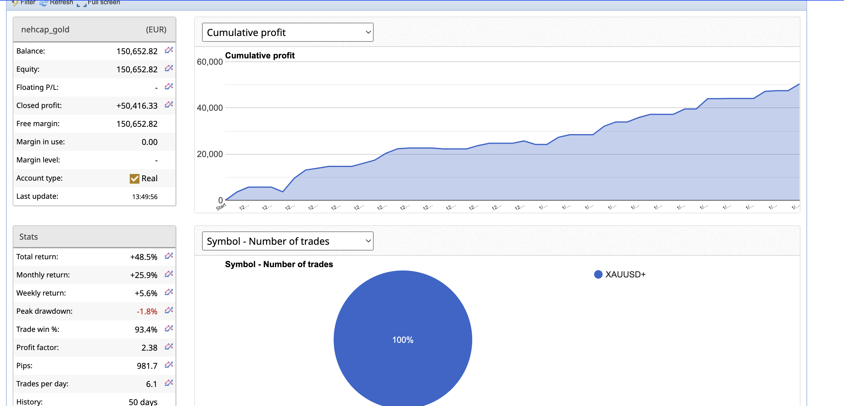 The equity curve for GoldScalper EA demonstrates a steady, upward trajectory, highlighting the system’s consistent profitability and low drawdowns. This smooth curve underscores the effectiveness of its high-frequency trading strategy, with minimal volatility and sustained growth over 421 trading days. The system’s disciplined approach provides reliable returns, reinforcing its appeal to investors seeking stability and long-term gains.