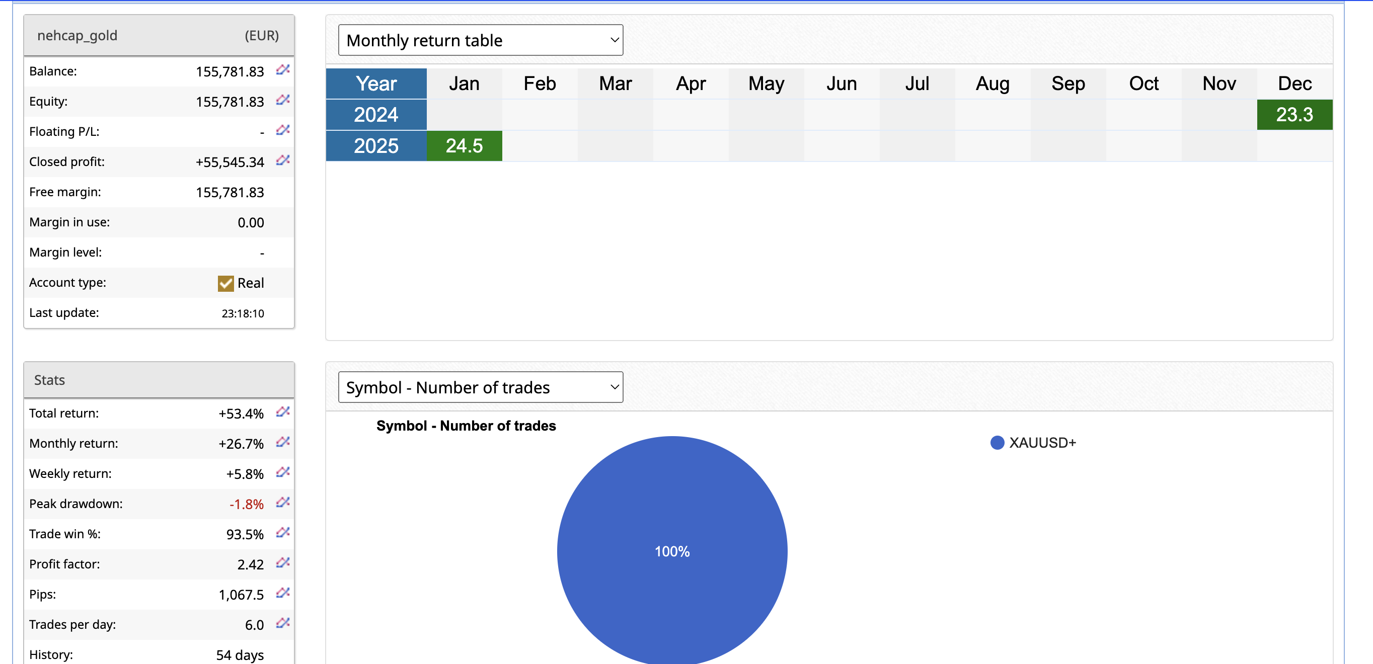 GOLDSCALPER returns storm higher as record returns made in January. Returns for January at +24.5%. December 2024 closed with a brilliant +23.5% as shown in live account below.
