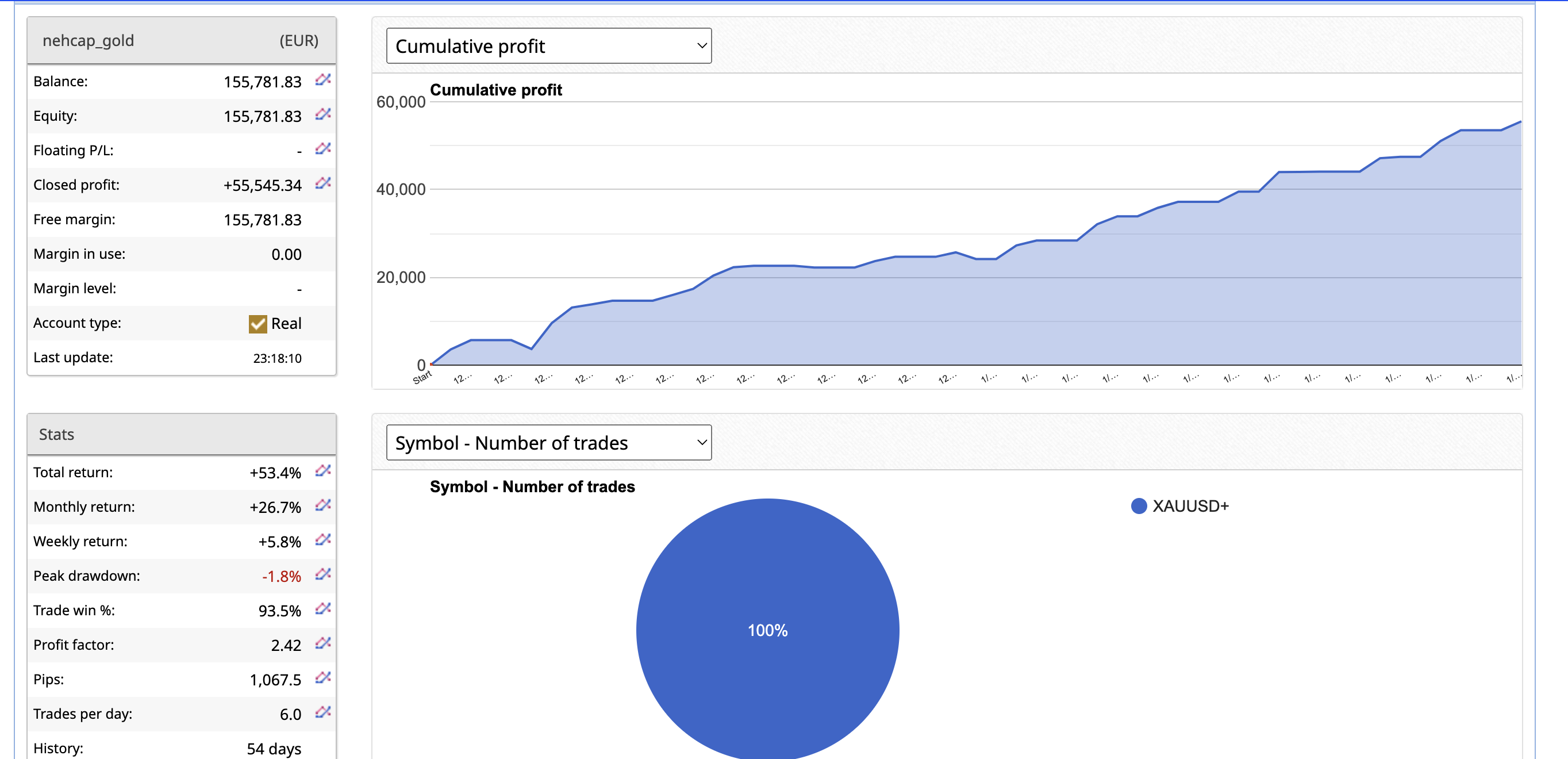 The equity curve for GoldScalper EA demonstrates a steady, upward trajectory, highlighting the system’s consistent profitability and low drawdowns. This smooth curve underscores the effectiveness of its high-frequency trading strategy, with minimal volatility and sustained growth over 421 trading days. The system’s disciplined approach provides reliable returns, reinforcing its appeal to investors seeking stability and long-term gains.