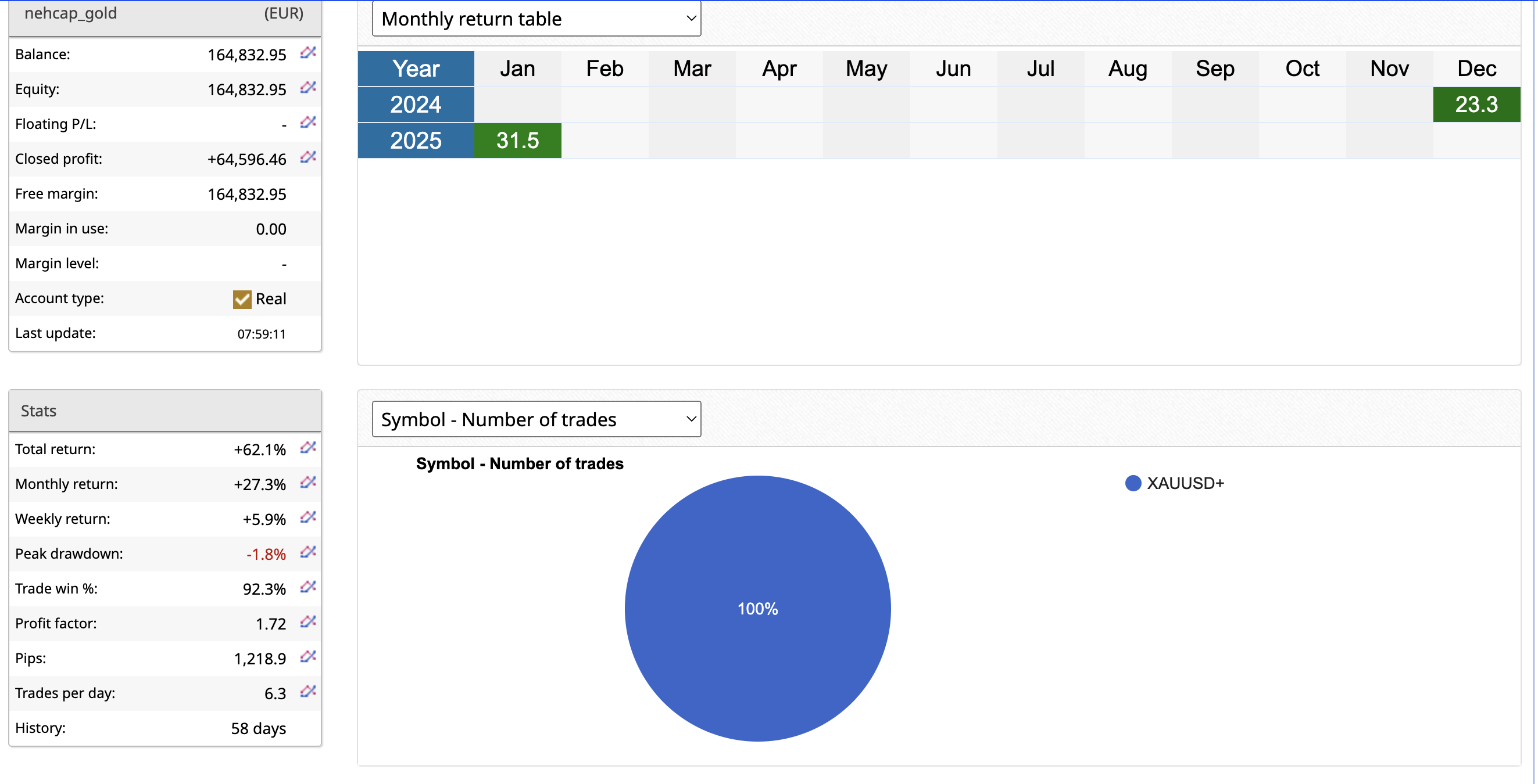 GOLDSCALPER (XAU/USD) )returns storm higher as record returns made in January. Returns for January at +31%. December 2024 closed with a brilliant +23.5% as shown in live account below.