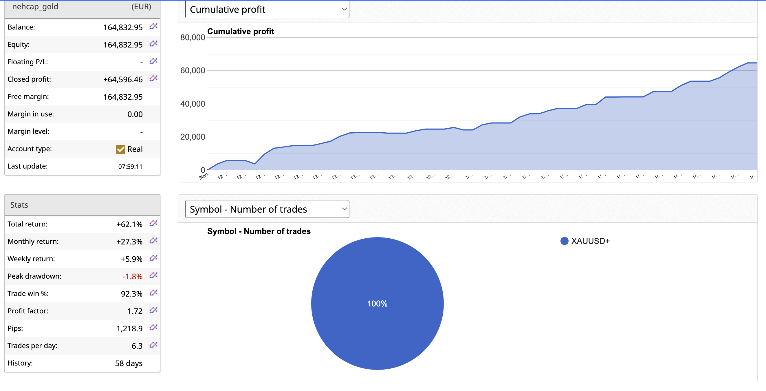 The equity curve for GoldScalper EA demonstrates a steady, upward trajectory, highlighting the system’s consistent profitability and low drawdowns. This smooth curve underscores the effectiveness of its high-frequency trading strategy, with minimal volatility and sustained growth over 421 trading days. The system’s disciplined approach provides reliable returns, reinforcing its appeal to investors seeking stability and long-term gains.