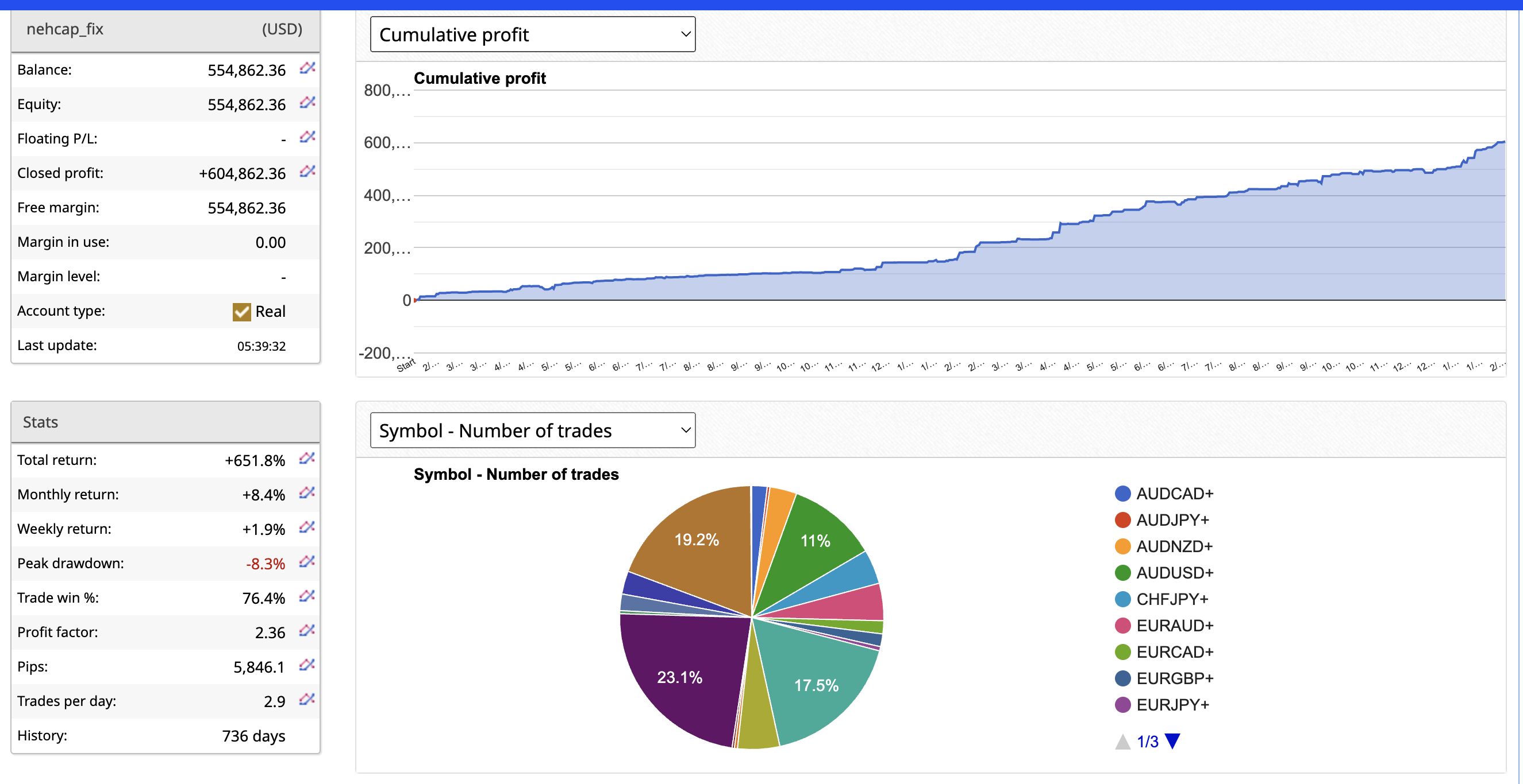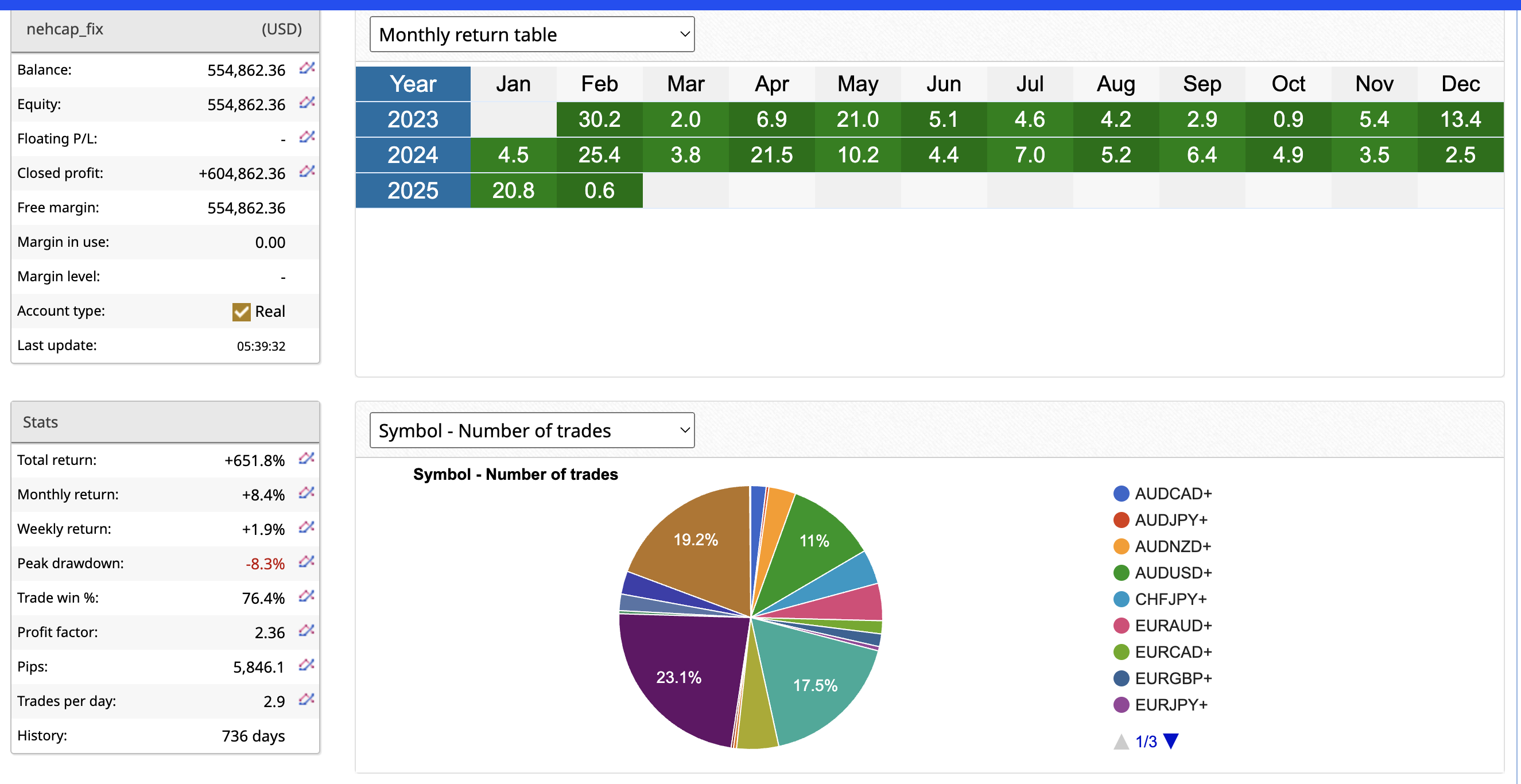 Nehcap.com HFT_FIX continues to demonstrate its exceptional performance as a leading High Frequency Trading system in the retail market. With over 2 years of live trading, it has consistently delivered profitability month after month. For January 2025, the system achieved an impressive +20.8% return, further propelling the account balance to nearly half a million dollars. As February commences, HFT_FIX has already delivered a solid +0.6% return, maintaining its trend of strong performance. This success is driven by its robust infrastructure, ultra-fast execution, and a non-Grid, non-martingale strategy that ensures high precision in every trade. Overall, HFT_FIX has delivered total returns of +651%, reinforcing its position as one of the most reliable and profitable trading systems.