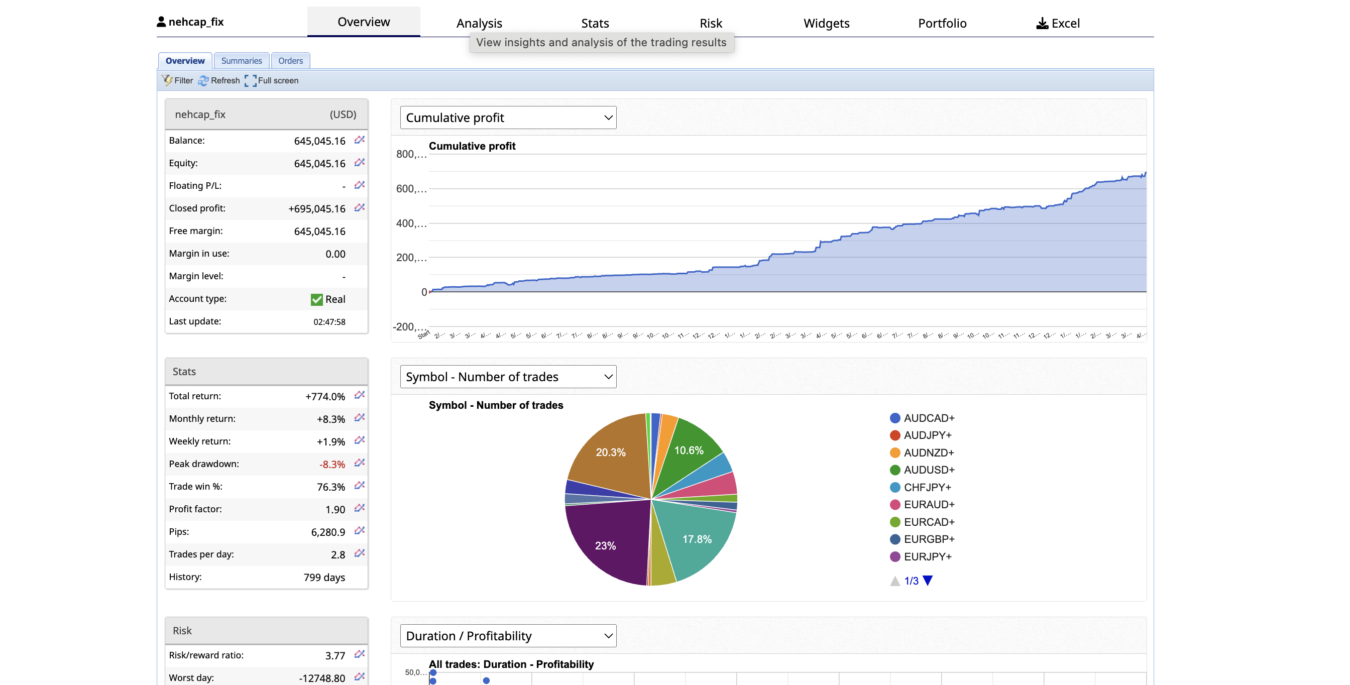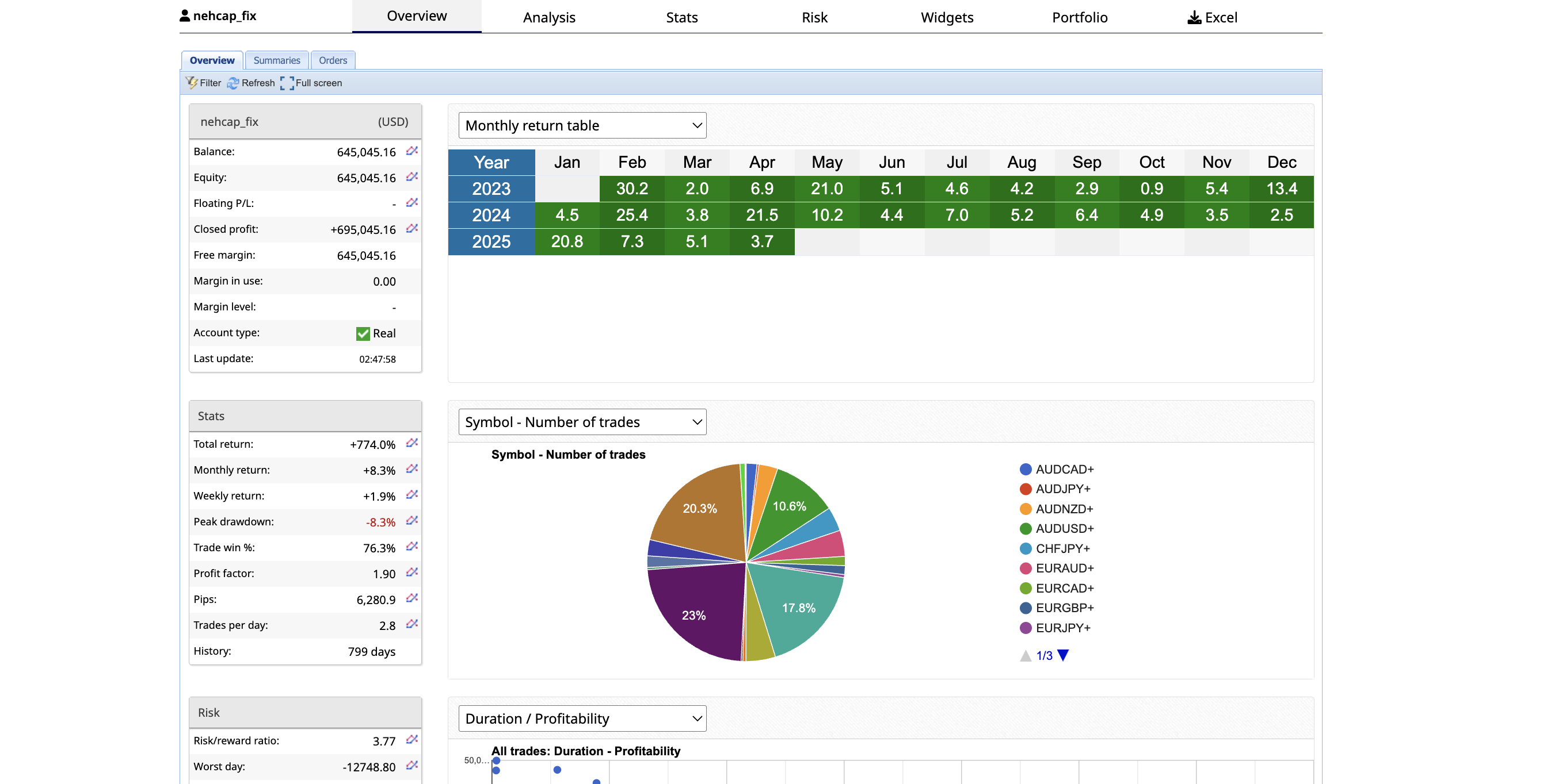 • Low Drawdowns: The system’s design, which leverages rapid execution using Fill-or-Kill (FOK) orders on FIX 4.4, has maintained exceptionally low drawdowns.