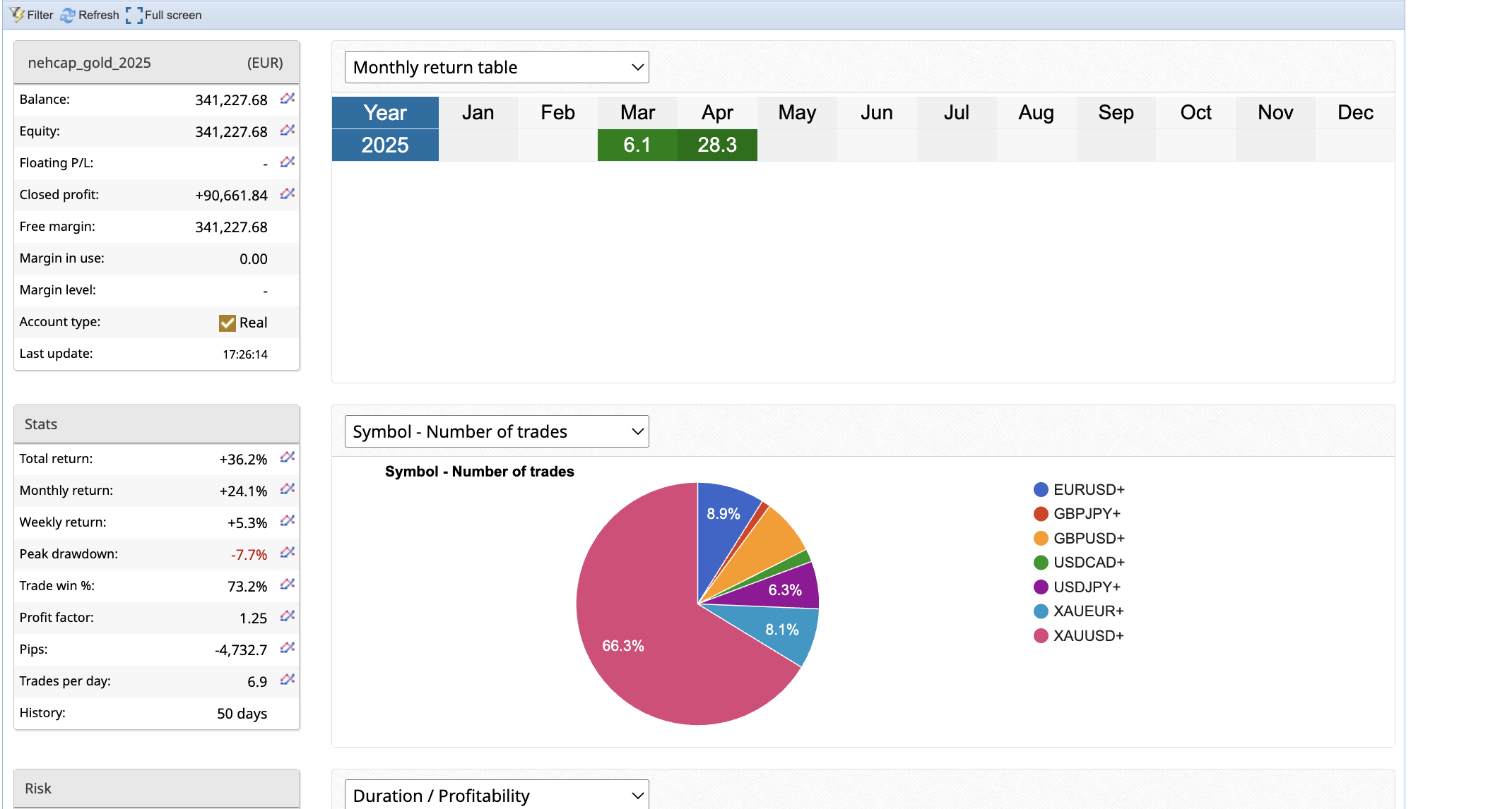 GOLDSCALPER (XAU/USD) ) returns in APRIL +28%. February returns added +47%. Low dd, continuous trading marks the system. MARCH RETURNS +6%