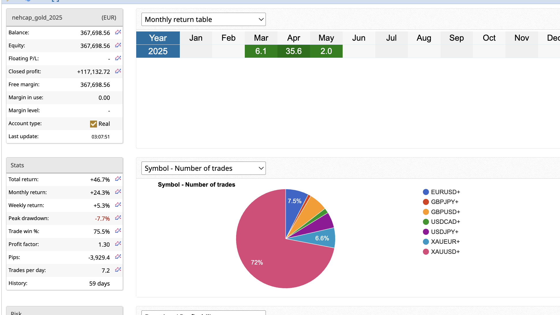 GOLDSCALPER is a legend in the making. On a regular basis the system continues to make between 20% and 30% return. MAY RETURNS UP +2%. APRIL RETURNS CLOSE AT +35%. A true tested LEGEND of a wealth maker !