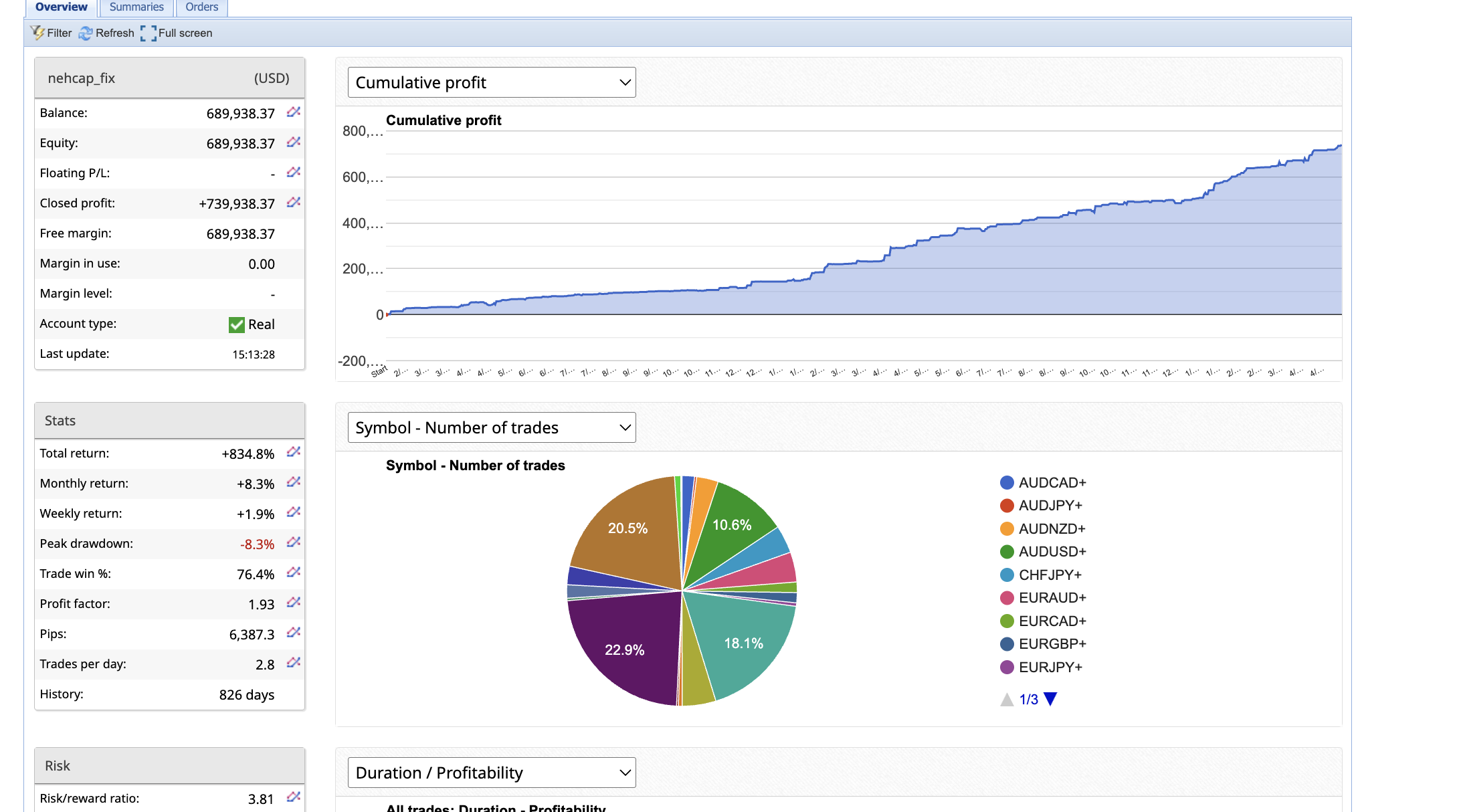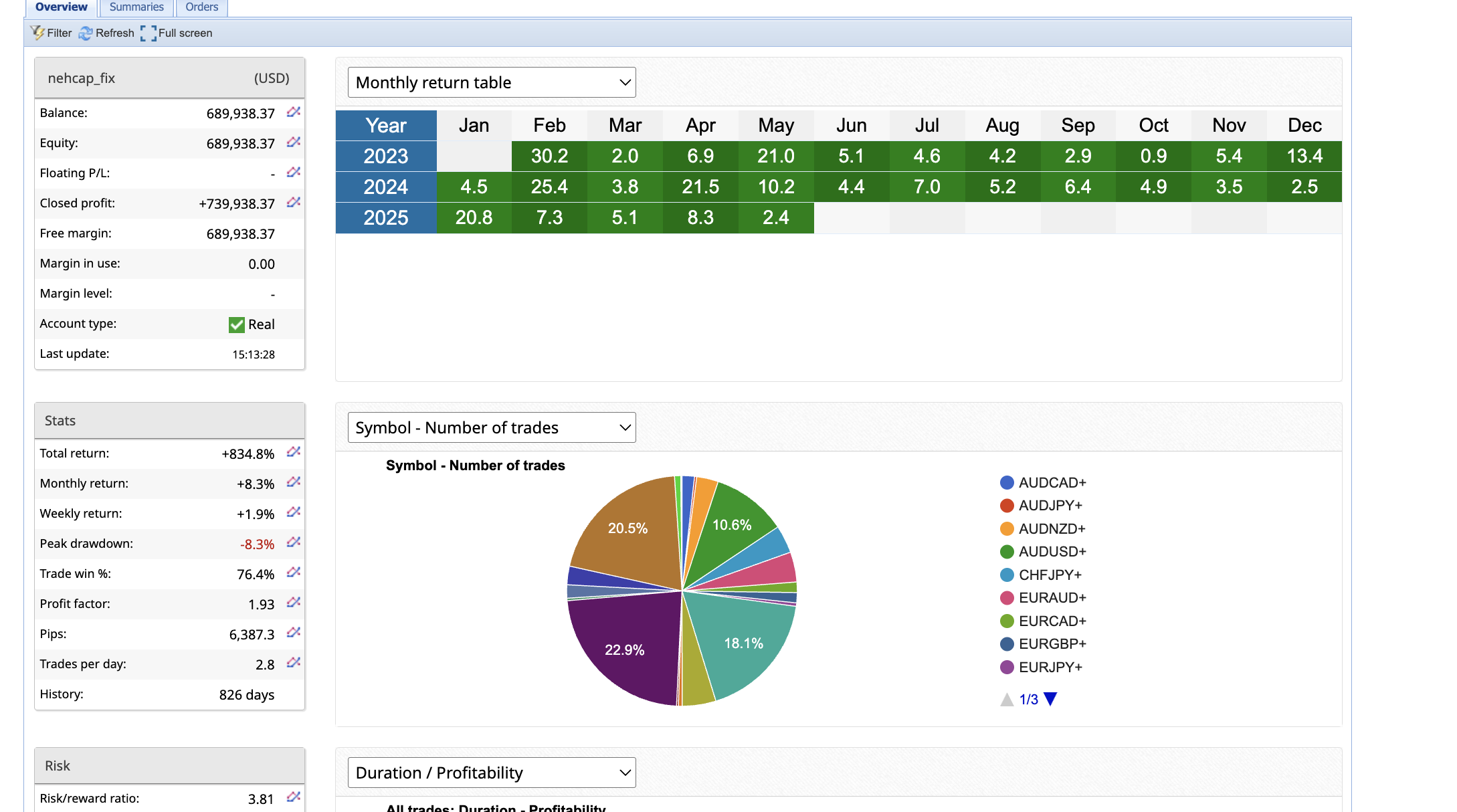 • Low Drawdowns: The system’s design, which leverages rapid execution using Fill-or-Kill (FOK) orders on FIX 4.4, has maintained exceptionally low drawdowns.