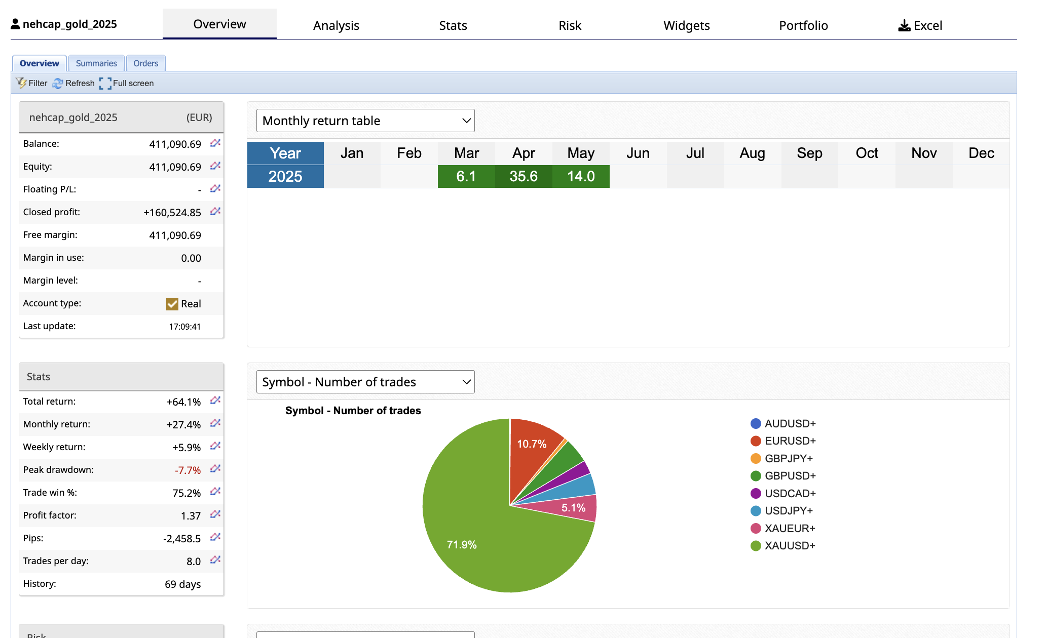 GOLDSCALPER is a brilliant SCALPER system on GOLD. Live account for over 2 years running beautifully. On a regular basis the system continues to make between 20% and 30% return. MAY RETURNS UP +14%. APRIL RETURNS CLOSE AT +35%. A true tested LEGEND of a wealth maker !