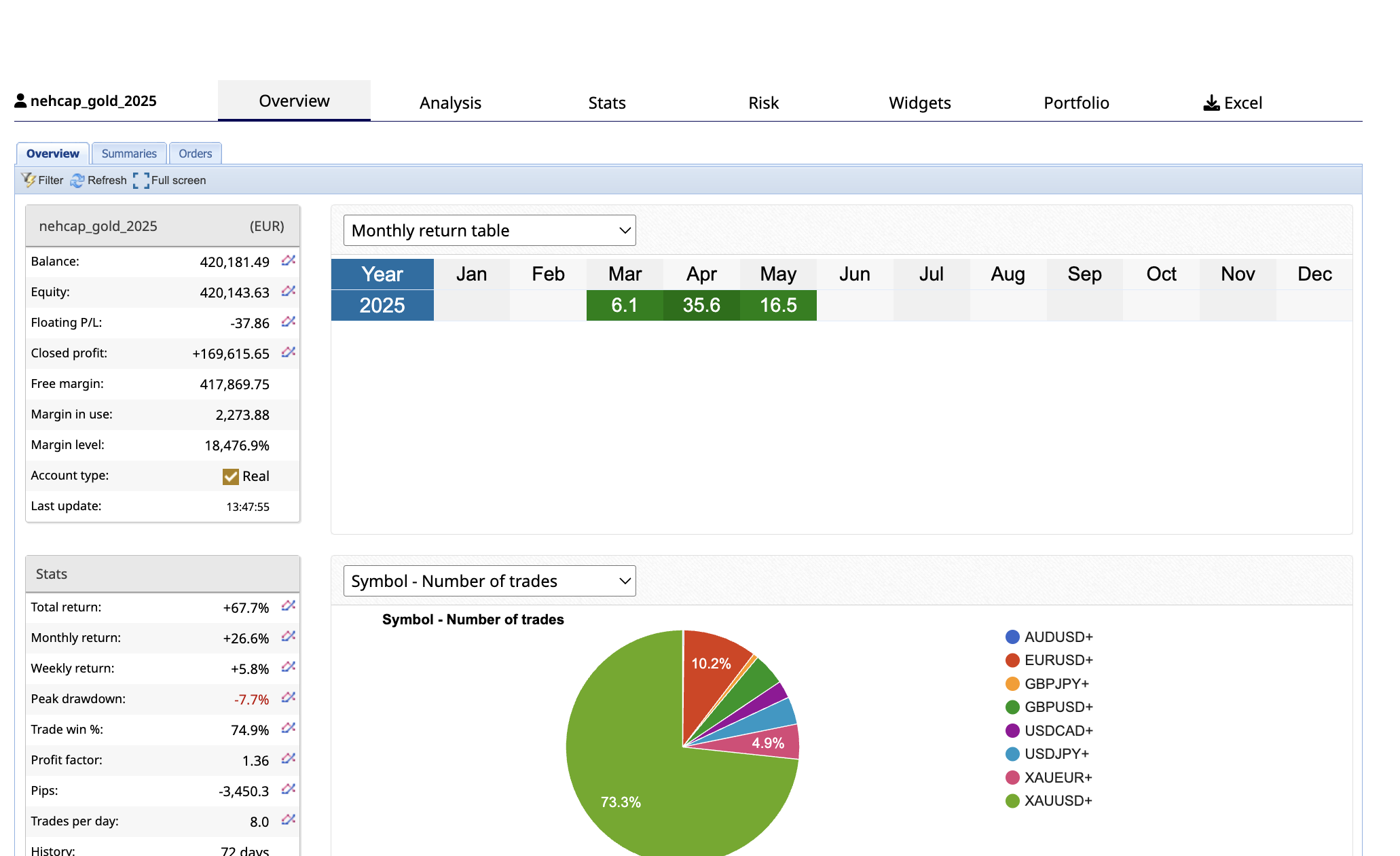 - Drawdown: Kept to a maximum of 15%, ensuring stable equity growth through prudent risk management.