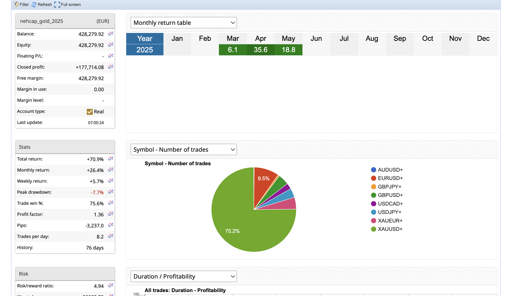 - Drawdown: Kept to a maximum of 15%, ensuring stable equity growth through prudent risk management.