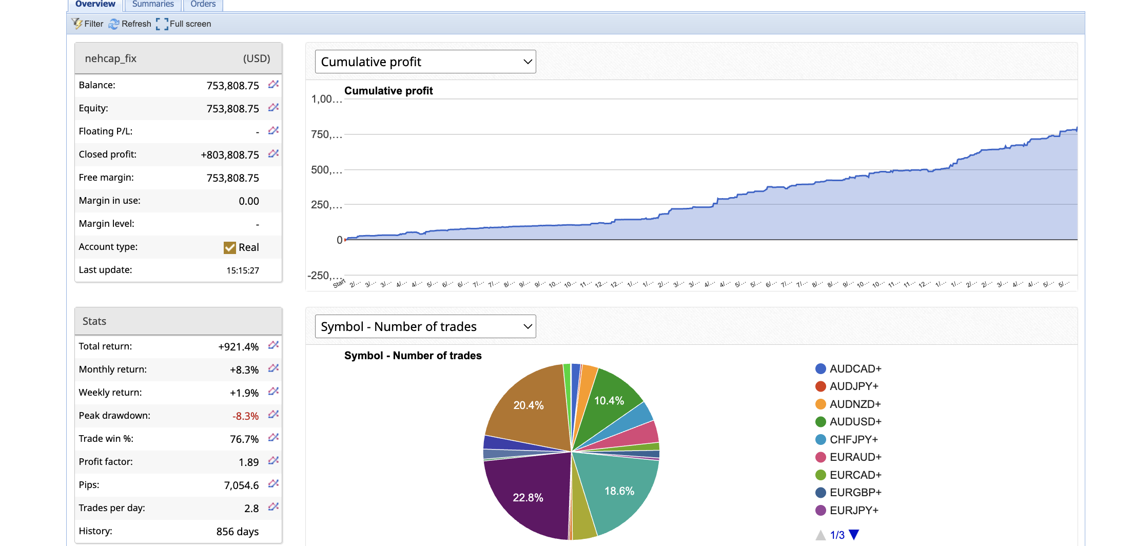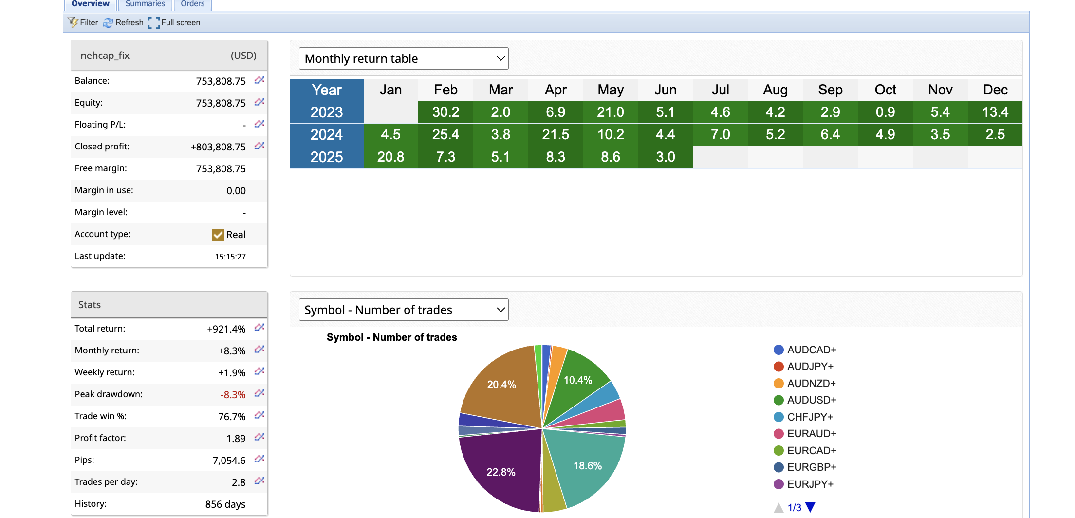 hft_fix continues to deliver outstanding results, consistently proving its reliability as a high-frequency trading system. Its landmark achievement of +500% overall returns, combined with controlled drawdowns and steady profit accumulation, solidifies its position as a leading tool for traders seeking consistent growth in a dynamic market. The system’s ongoing success underscores its value in the HFT domain, providing a strong foundation for future gains.