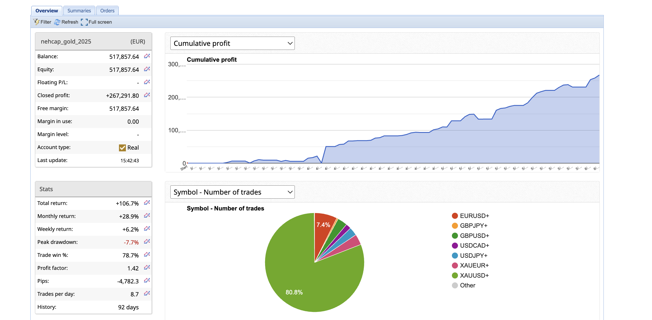 - Drawdown: Kept to a maximum of 15%, ensuring stable equity growth through prudent risk management.