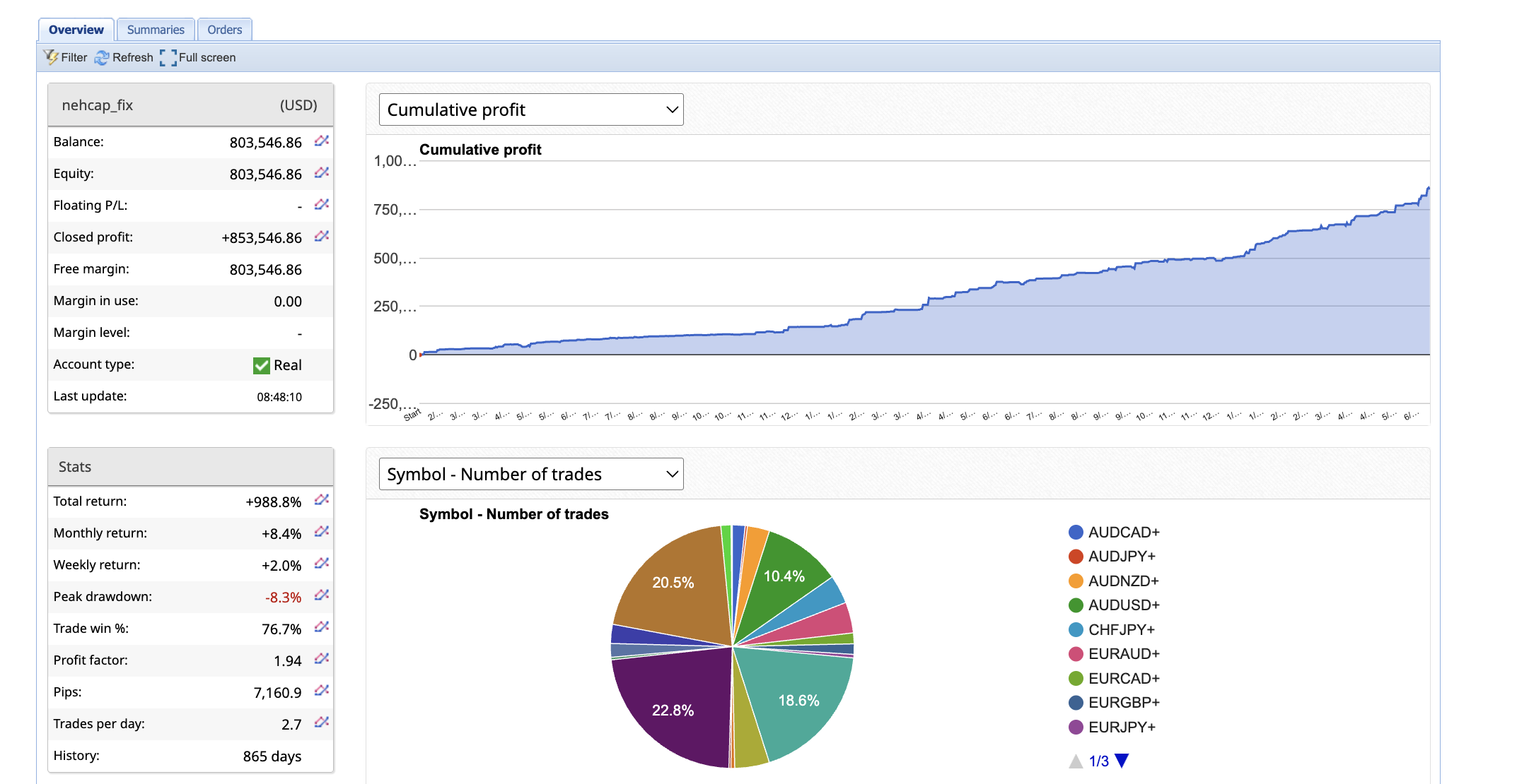 hft_fix continues to deliver outstanding results, consistently proving its reliability as a high-frequency trading system. Its landmark achievement of +500% overall returns, combined with controlled drawdowns and steady profit accumulation, solidifies its position as a leading tool for traders seeking consistent growth in a dynamic market. The system’s ongoing success underscores its value in the HFT domain, providing a strong foundation for future gains.