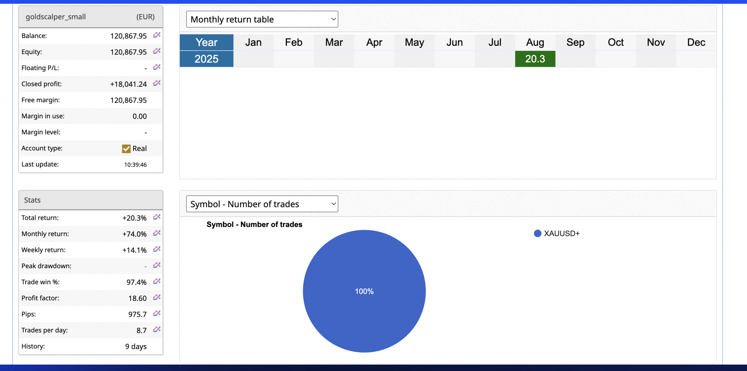 GOLDSCALPER EA continues to surge higher. August 2025 returns crosses +20% . Powerful scalping all day.