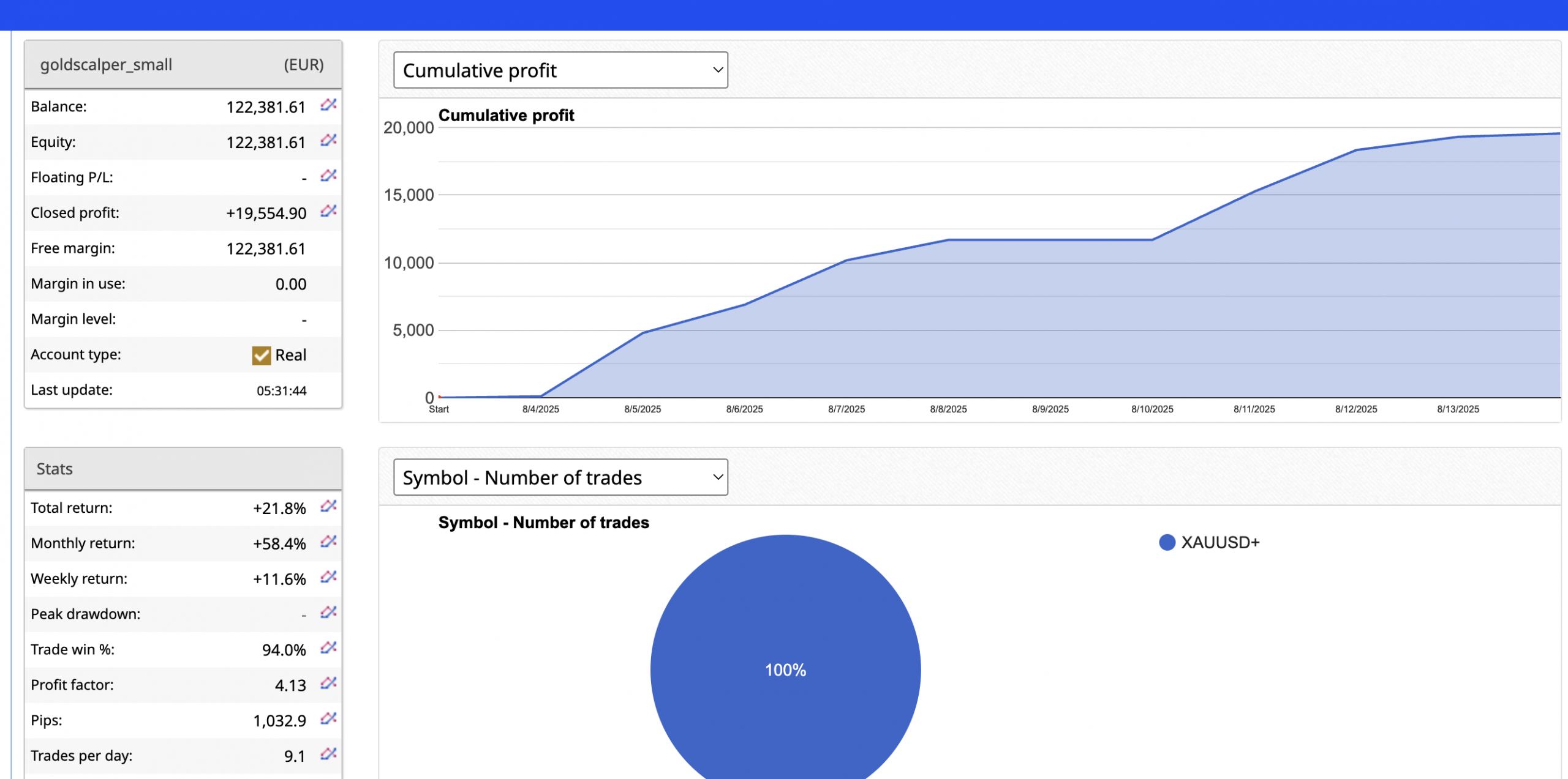 GOLDSCALPER EA continues to surge higher. August 2025 returns crosses +21.8% . Powerful scalping all day.