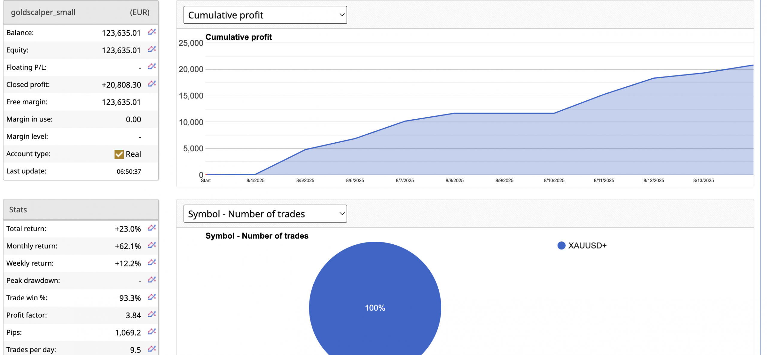 GOLDSCALPER EA continues to surge higher. August 2025 returns crosses +23% . Powerful scalping all day.