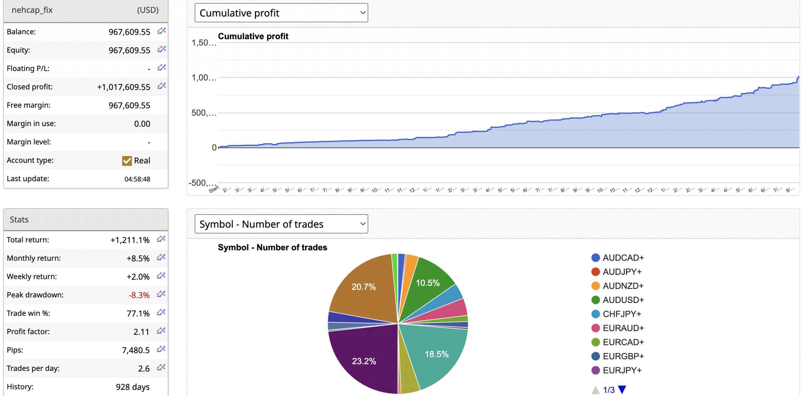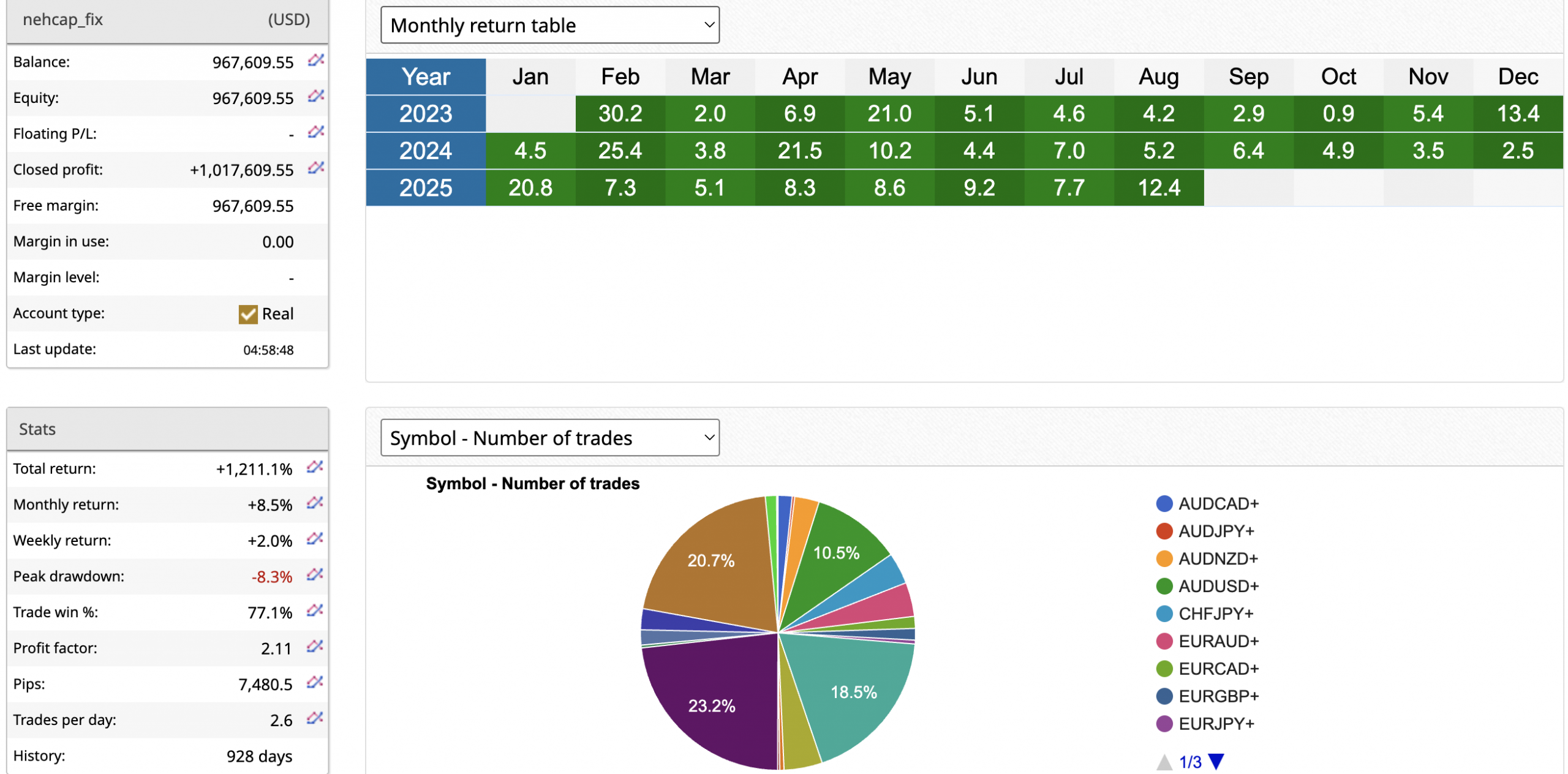hft_fix continues to deliver outstanding results, consistently proving its reliability as a high-frequency trading system. Its landmark achievement of +500% overall returns, combined with controlled drawdowns and steady profit accumulation, solidifies its position as a leading tool for traders seeking consistent growth in a dynamic market. The system’s ongoing success underscores its value in the HFT domain, providing a strong foundation for future gains.