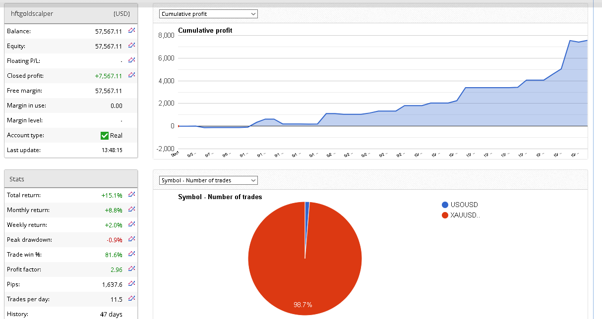 GOLD scalper is a HFT trading system working on both the FIX 4.4 protocol and MT4 terminal. This a NON-GRID scalper system. The system identifies sharp movements in the gold market and is able to enter at fast speed. The system also operates on MT4.